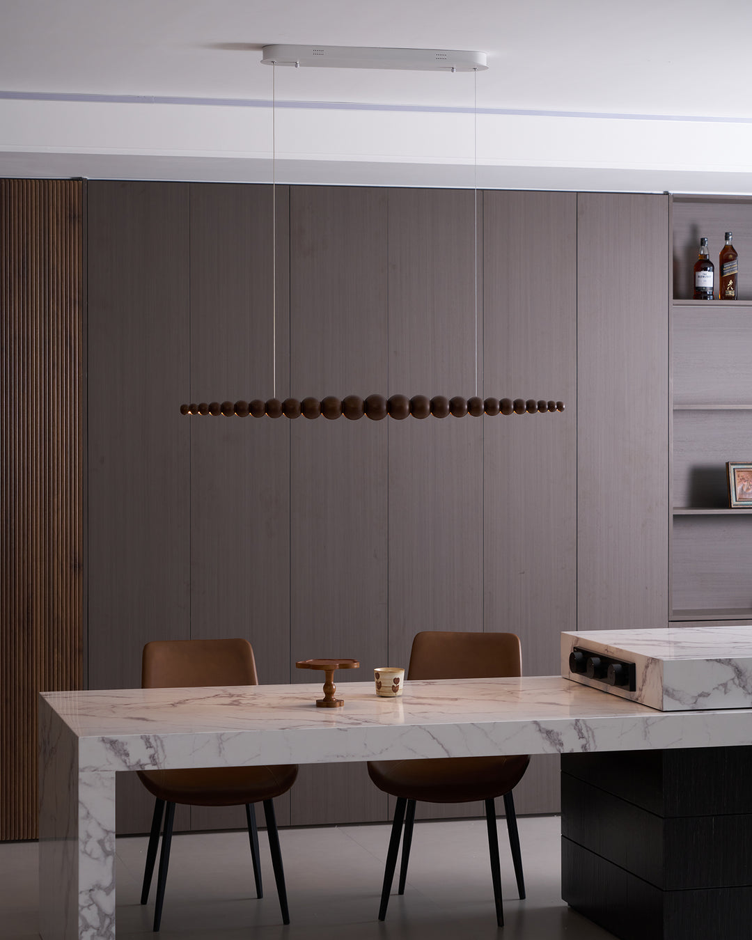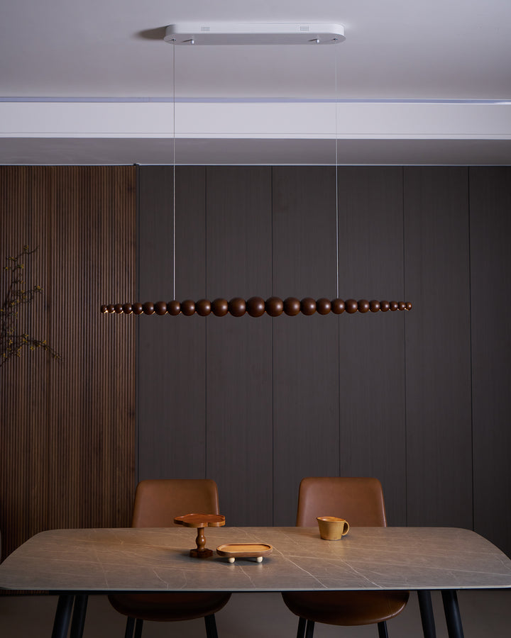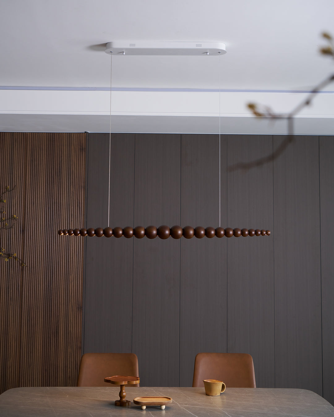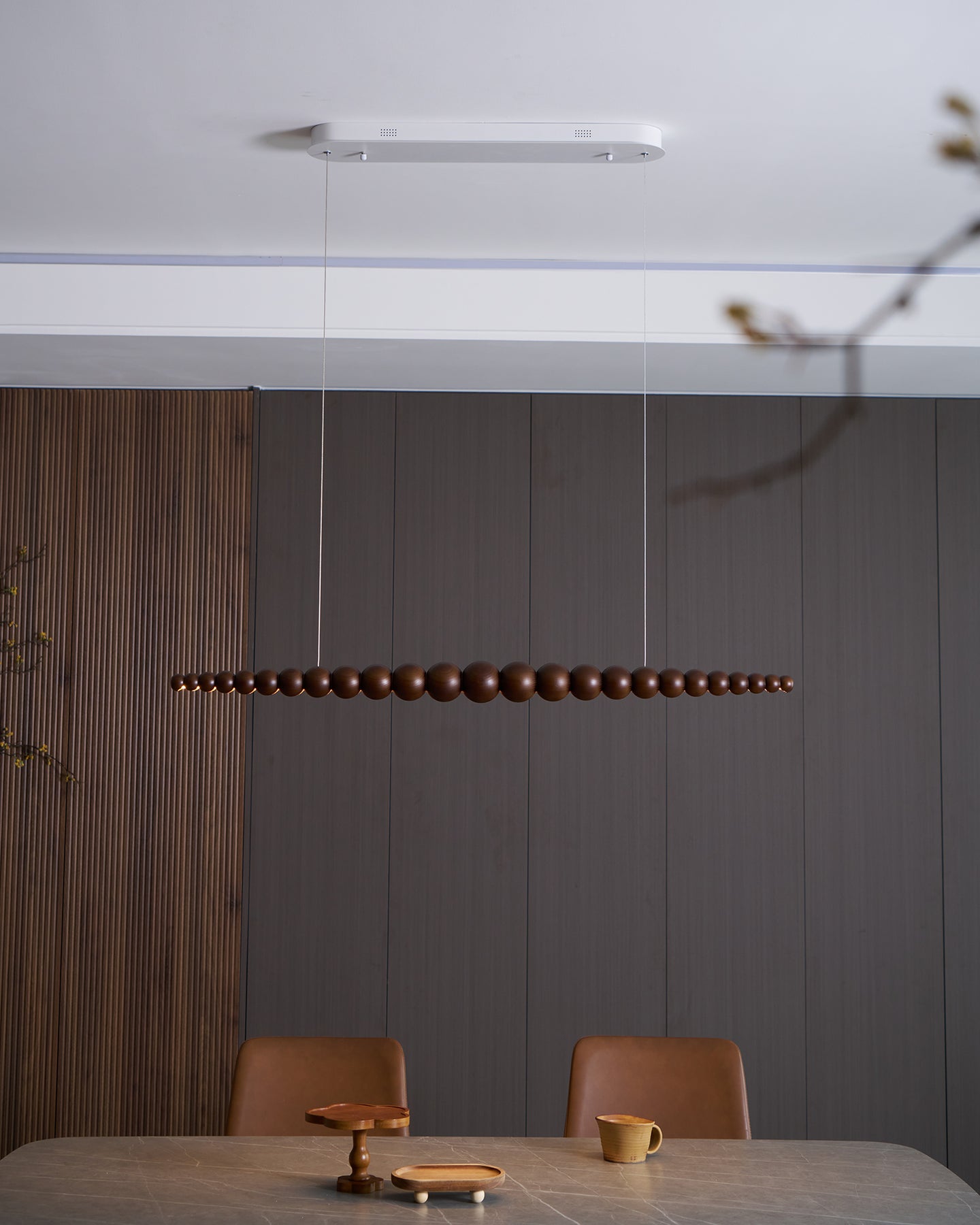 De Woodline Orb hanglamp is geïnspireerd op de natuurlijke schoonheid van hout en de tijdloze elegantie van bolvormige vormen. Deze prachtige lamp bestaat uit een reeks houten bollen, zorgvuldig lineair gerangschikt, wat een harmonieus en evenwichtig ontwerp creëert. De warme, natuurlijke houttinten voegen een vleugje organische charme toe, terwijl de minimalistische opstelling zorgt voor een moderne en verfijnde esthetiek. Perfect voor eetkamers, keukens of woonruimtes, combineert de Woodline Orb hanglamp het organische met het moderne en biedt zowel functionele verlichting als een boeiend artistiek statement.