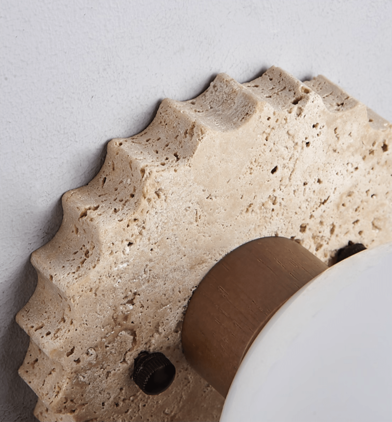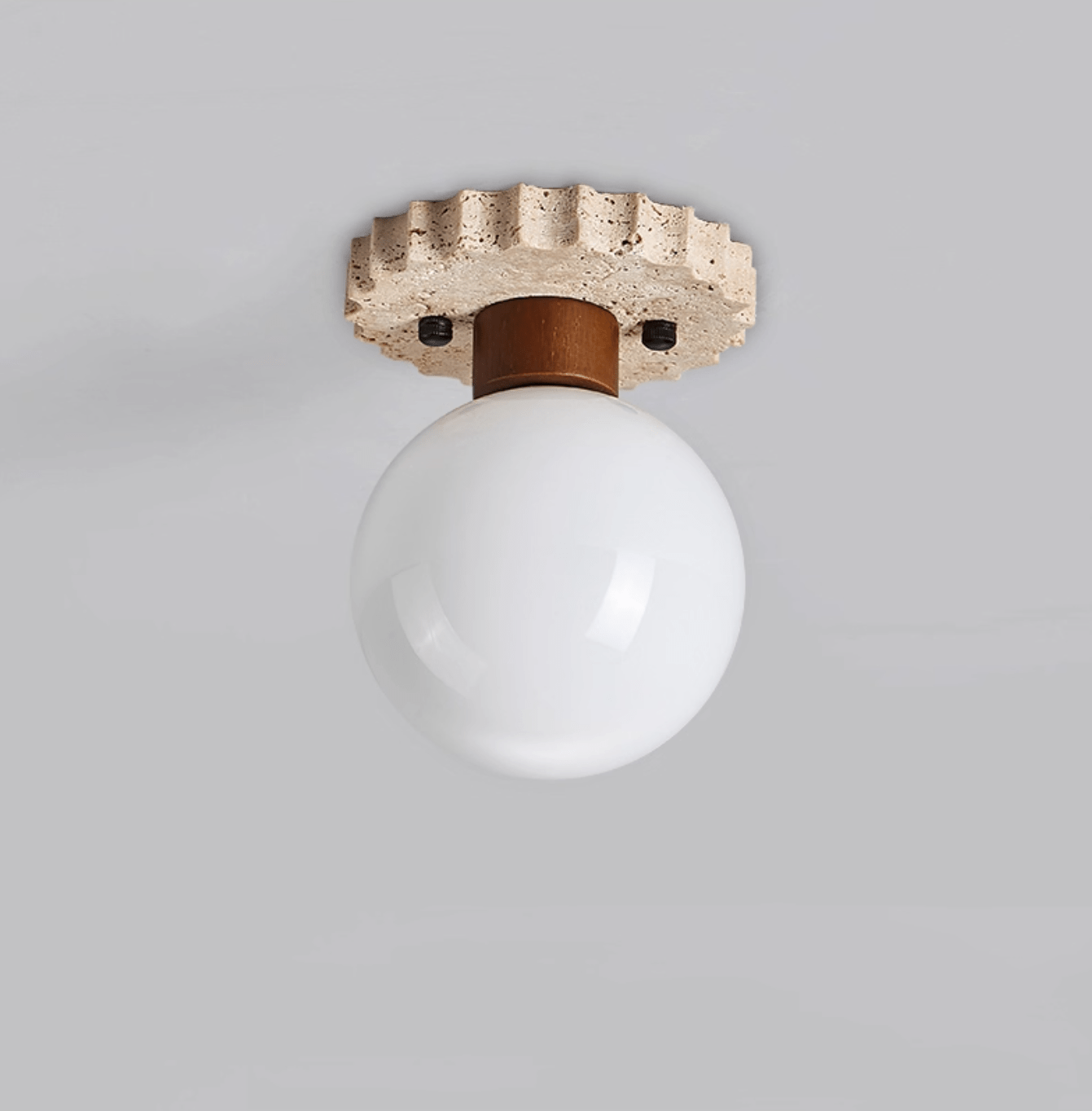 This distinctive fixture features a luminous, spherical frosted glass orb that emits a soft, ambient glow. It is elegantly affixed to a contrasting circular ceiling plate crafted from textured travertine stone, intricately carved with a striking cog-like, ribbed edge. A warm wooden accent connects the elements, blending natural materials with a subtle industrial-organic aesthetic. Perfect for adding understated character and diffused light to hallways, entryways, or low-ceilinged rooms.