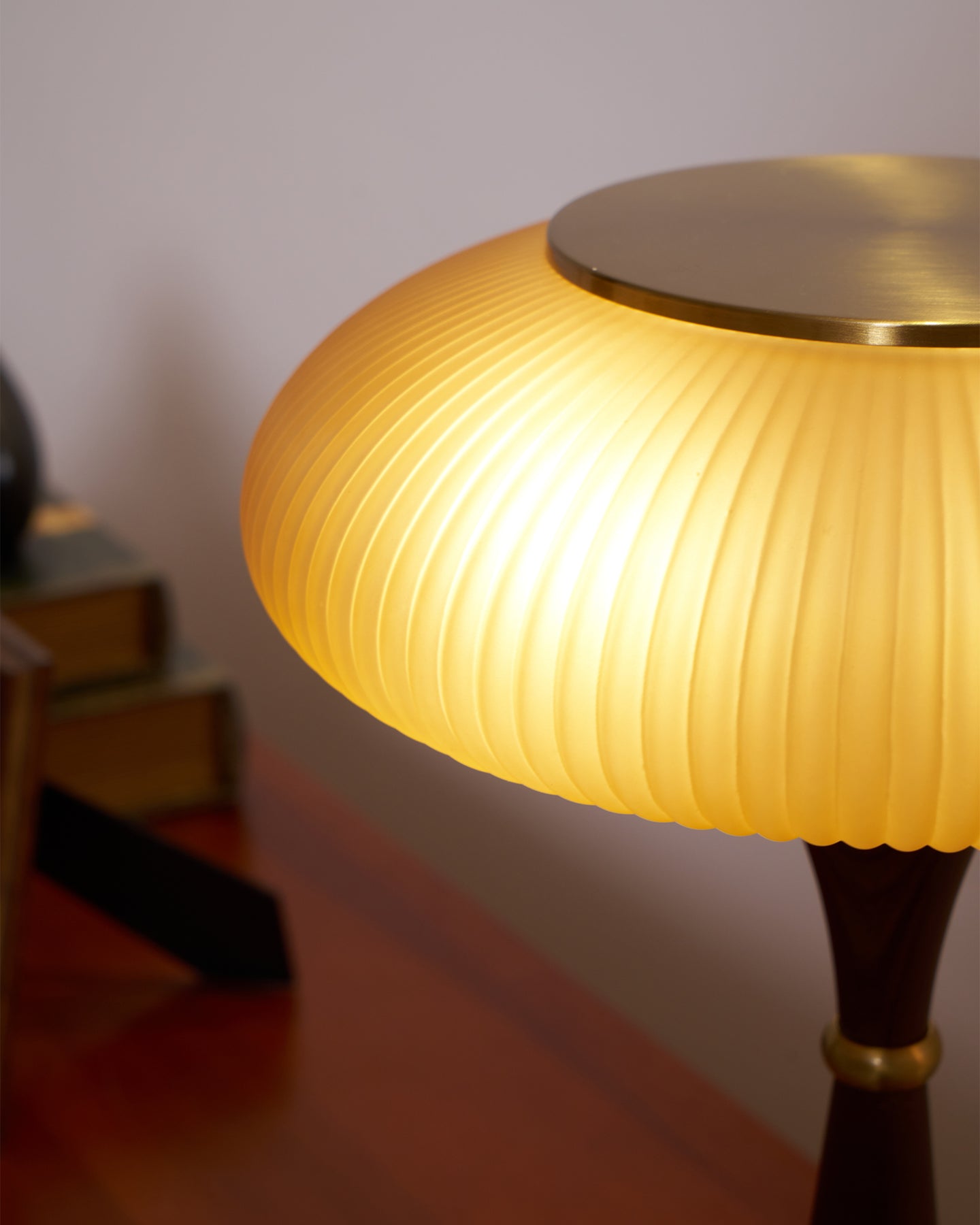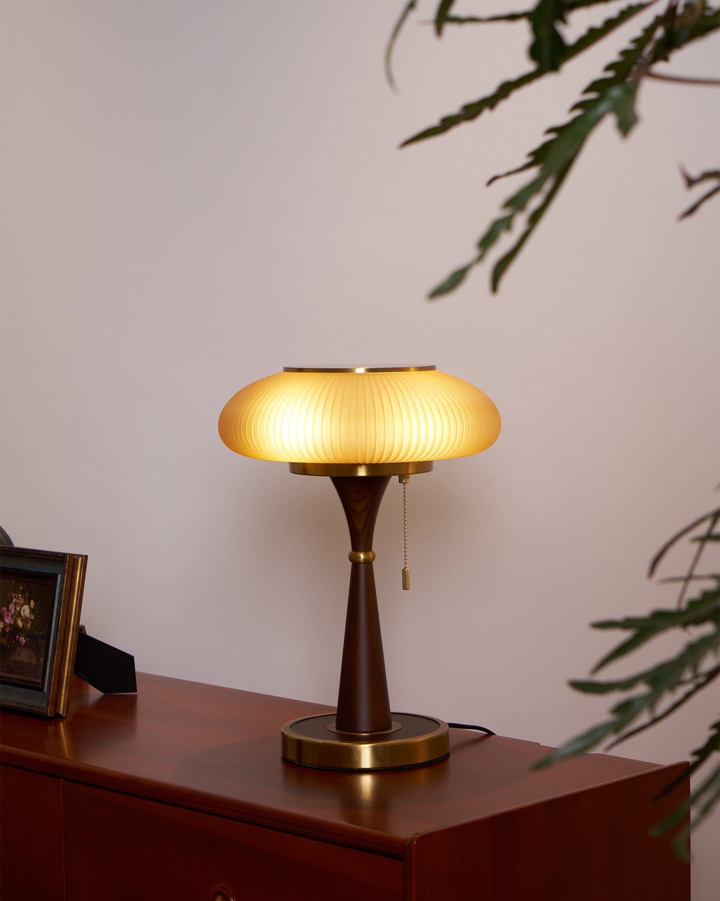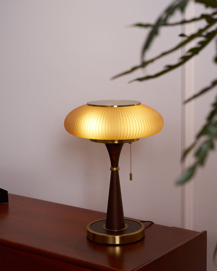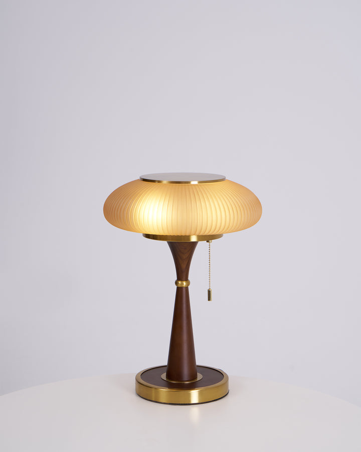 De Matsutake tafellamp is geïnspireerd op de elegante en iconische vorm van de Matsutake-paddenstoel, geroemd om zijn unieke vorm en natuurlijke schoonheid. De lamp heeft een sierlijk gebogen voet met een getextureerde, paddenstoelvormige lampenkap, die een warme, sfeervolle gloed creëert.