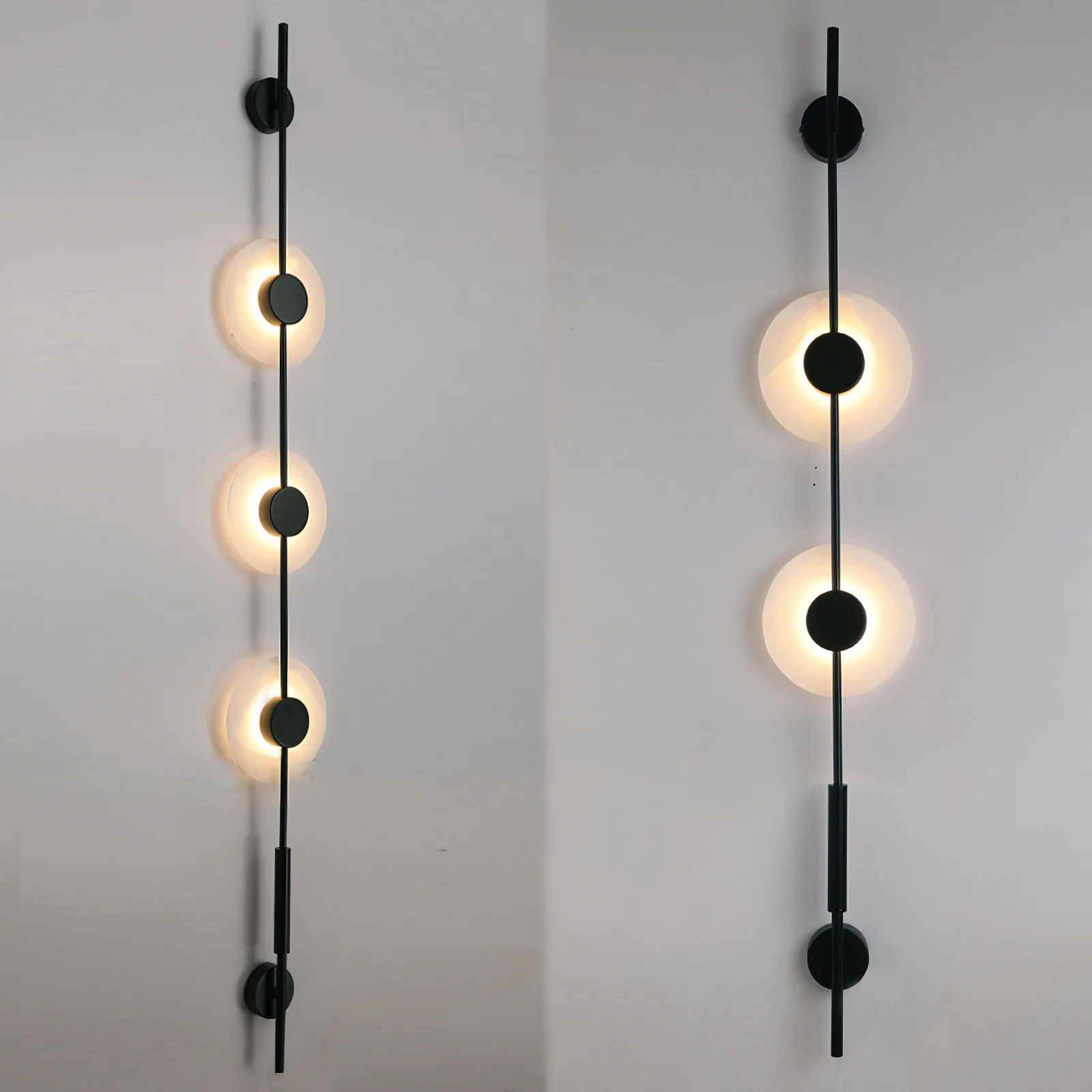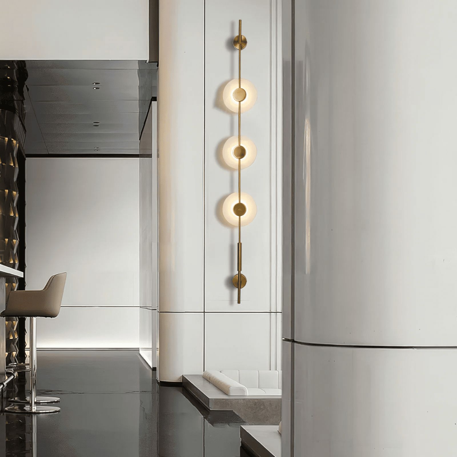 Designed for modern interiors, this sconce is a testament to understated luxury. The vertical arrangement draws the eye upward, enhancing the height of any space, while the soft glow from the alabaster orbs provides ambient lighting that's both functional and atmospheric.