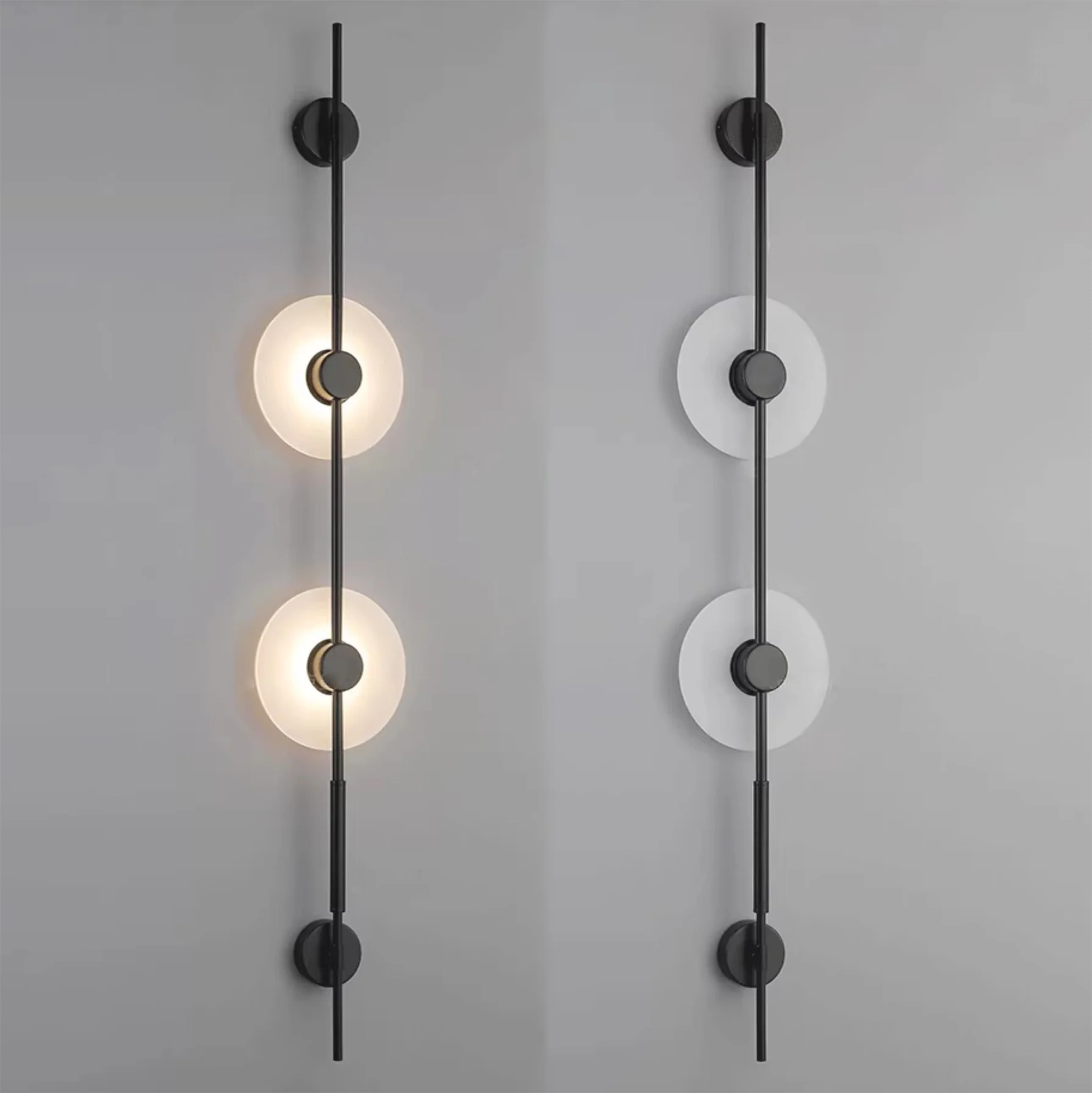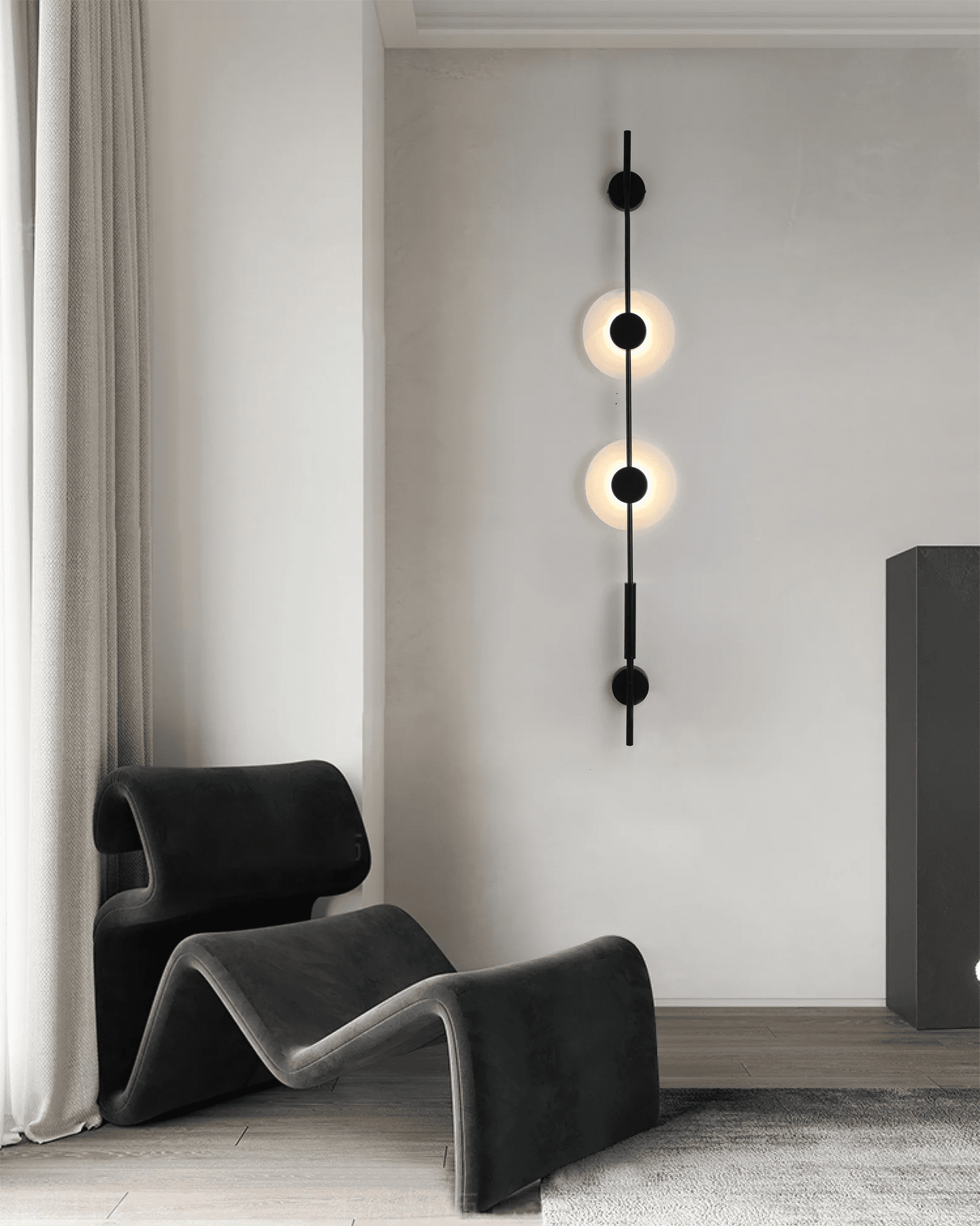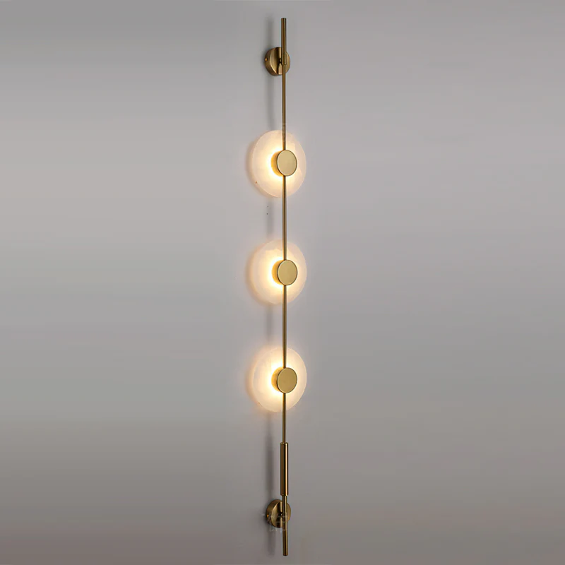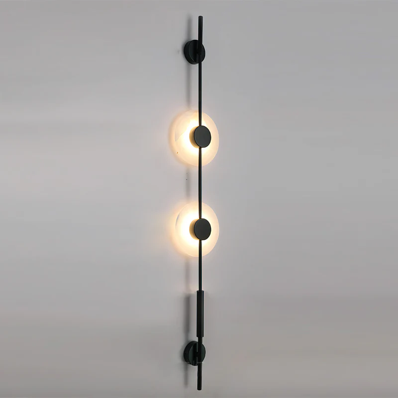The Alabaster Vertical Wall Sconce is a striking fusion of minimalist metalwork and the soft luminescence of alabaster. This wall light features a sleek, vertical metal frame that holds aloft elegant alabaster discs, each glowing with a warm, welcoming light. The natural veining and subtle translucency of the alabaster create a captivating visual texture that contrasts beautifully with the clean lines of the metal structure.