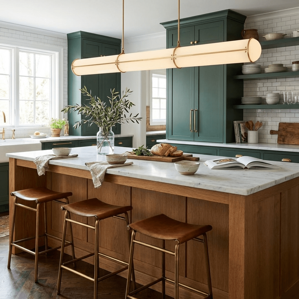 Pendants Over Island: These provide crucial task lighting for food prep and should hang 32-36 inches above the surface. Make sure that each pendant is about 1/4 the length of the island to provide sufficient coverage without overwhelming the space.