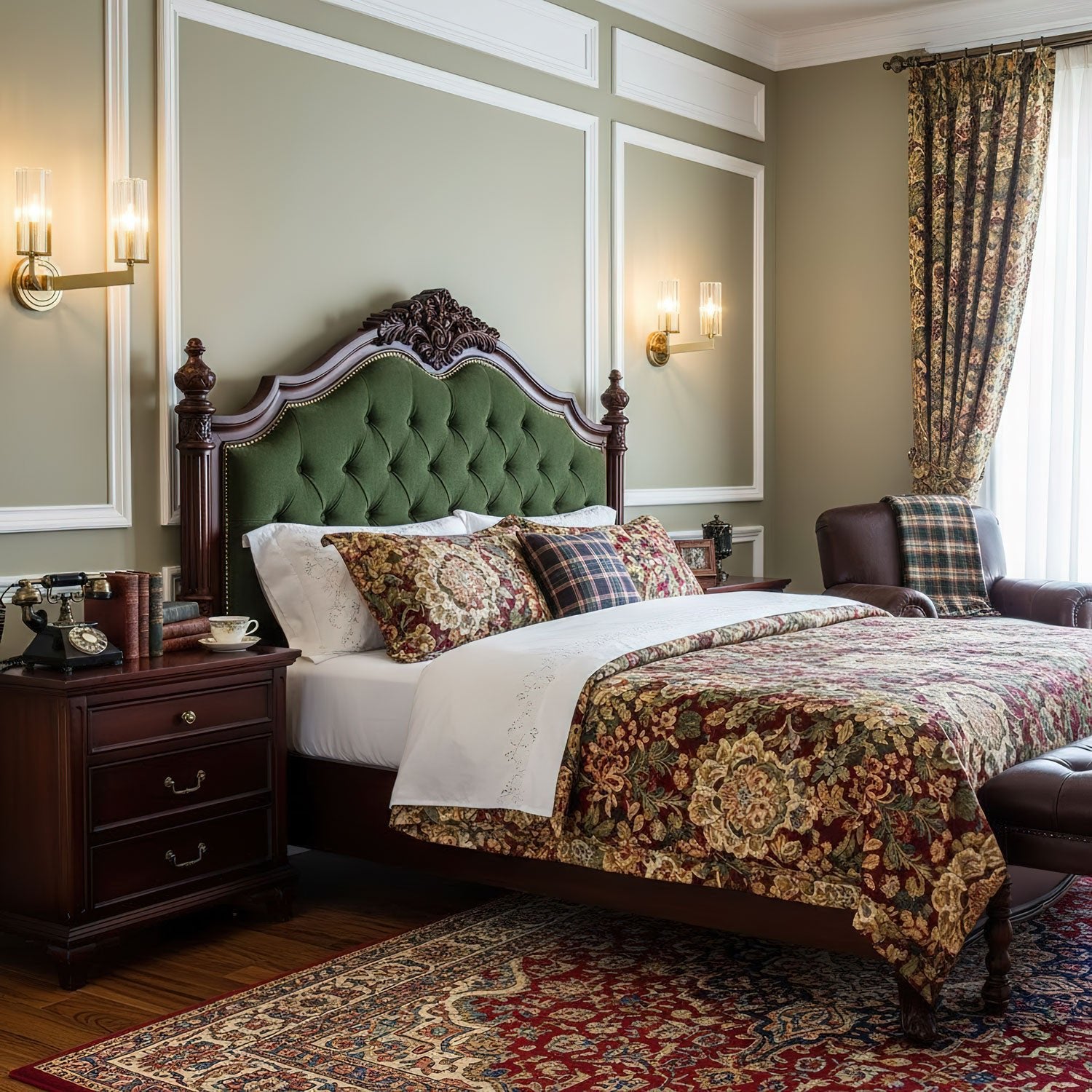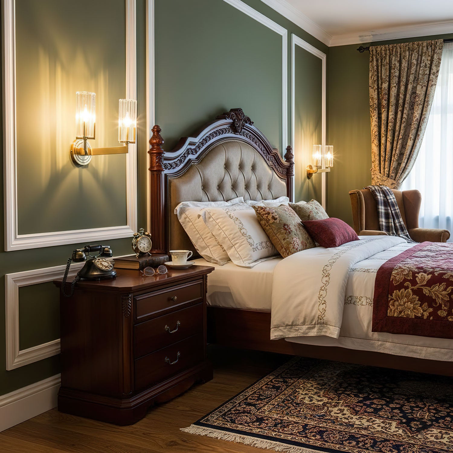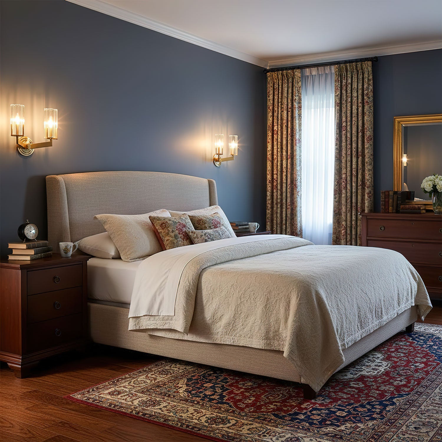 Task Lighting: Bedside lamps or wall sconces should be proportionate to the size of the nightstands and the bed. The lamp height should be roughly at eye level when sitting in bed.
