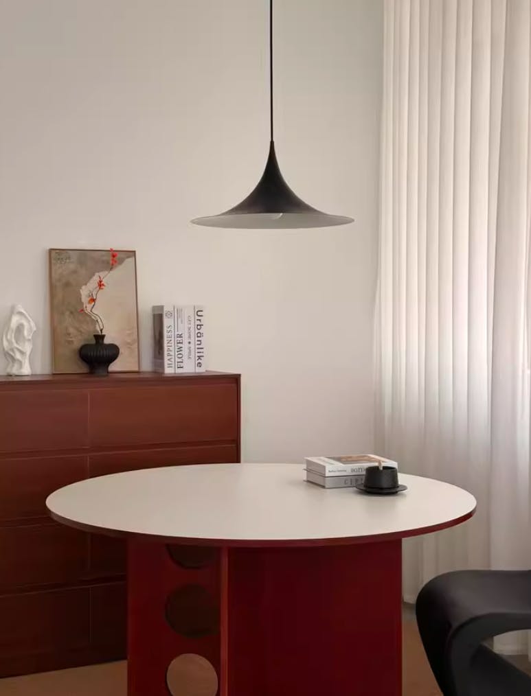 The Semi Pendant Lamp is a unique masterpiece based on two quarter-circles joined back-to-back. With its distinctive arch-shaped, enameled metal shade, lightness of form, and unique, timeless design, the elegant Semi lamp achieved great success in the 1980s and became the best-selling Danish design of that era, gaining worldwide recognition and iconic status. Its distinctive arch-shaped shade, crafted from lacquered, spun aluminum, creates a diffused, cone-shaped light ideal for placement over a dining table or kitchen work surface.