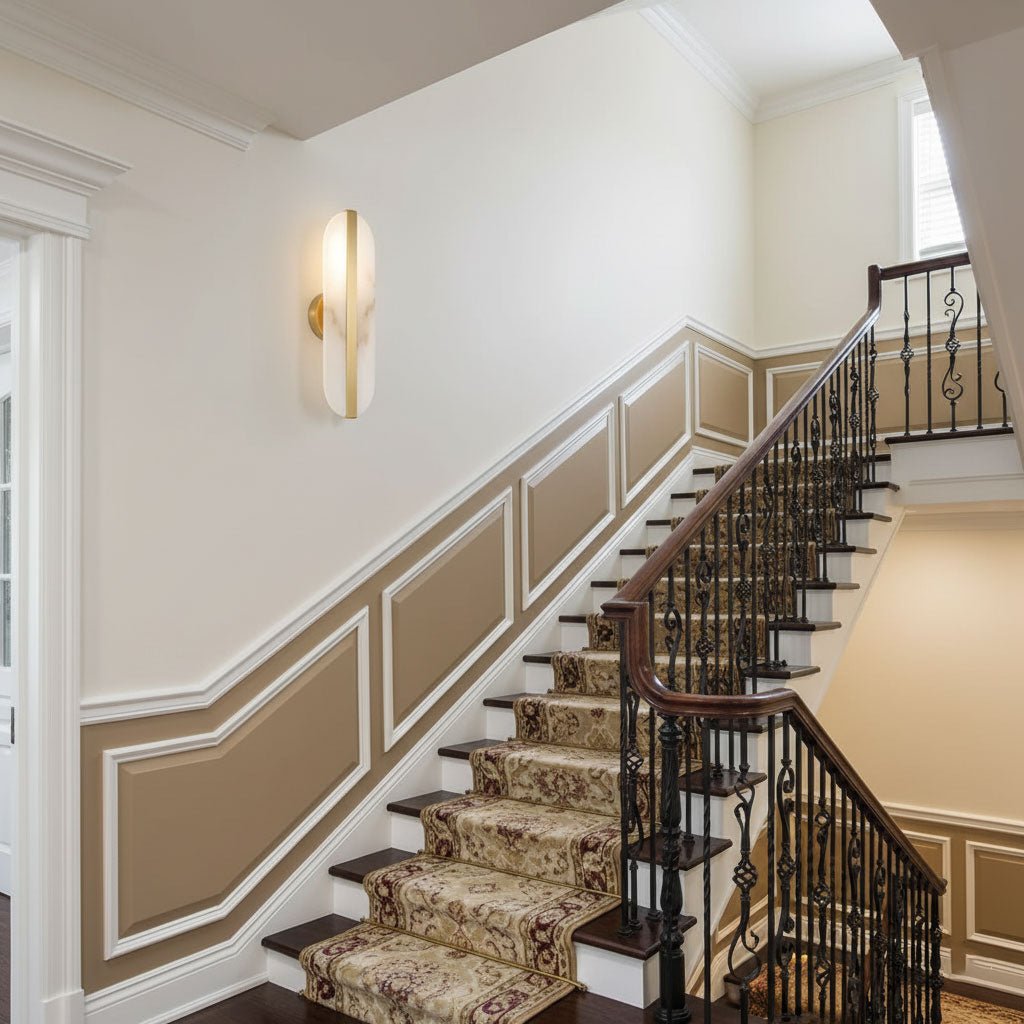 It has a low profile on the wall and can be placed vertically or horizontally. The oval shade evokes the look of alabaster. A brass metal band runs through the center of the shade. Integrated LED lights diffuse through it to cast ambient lighting and create warm reflections on the walls.
