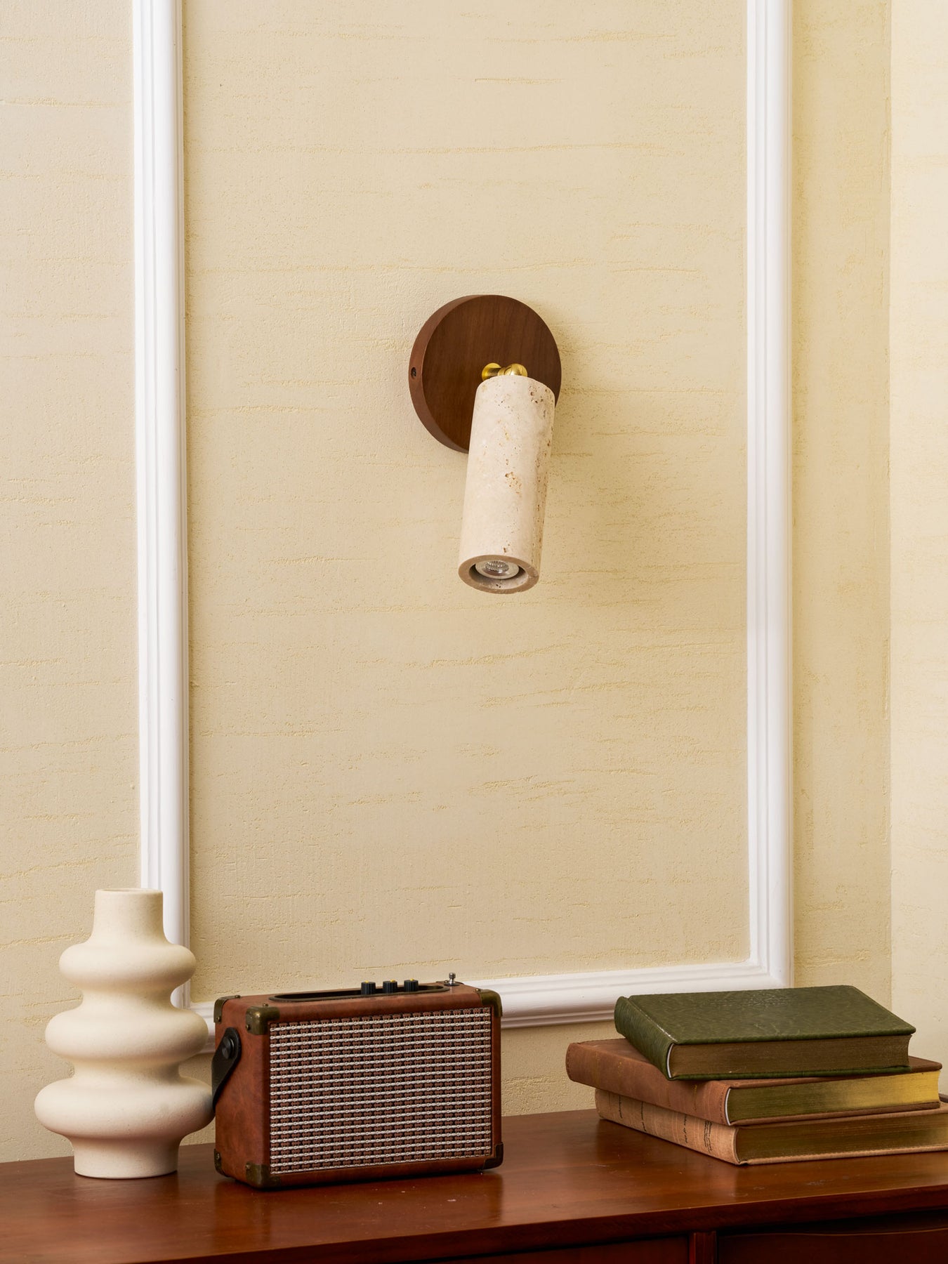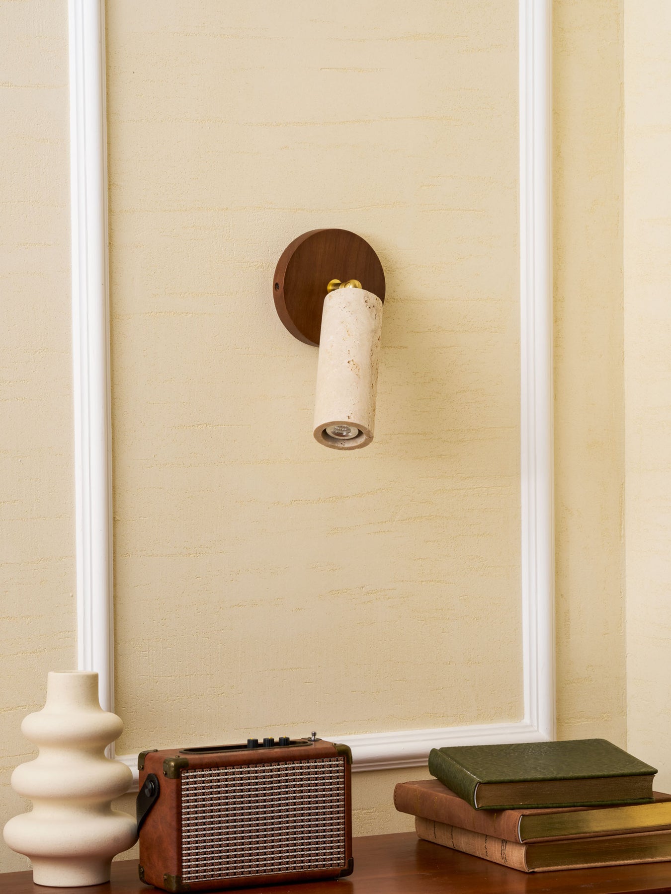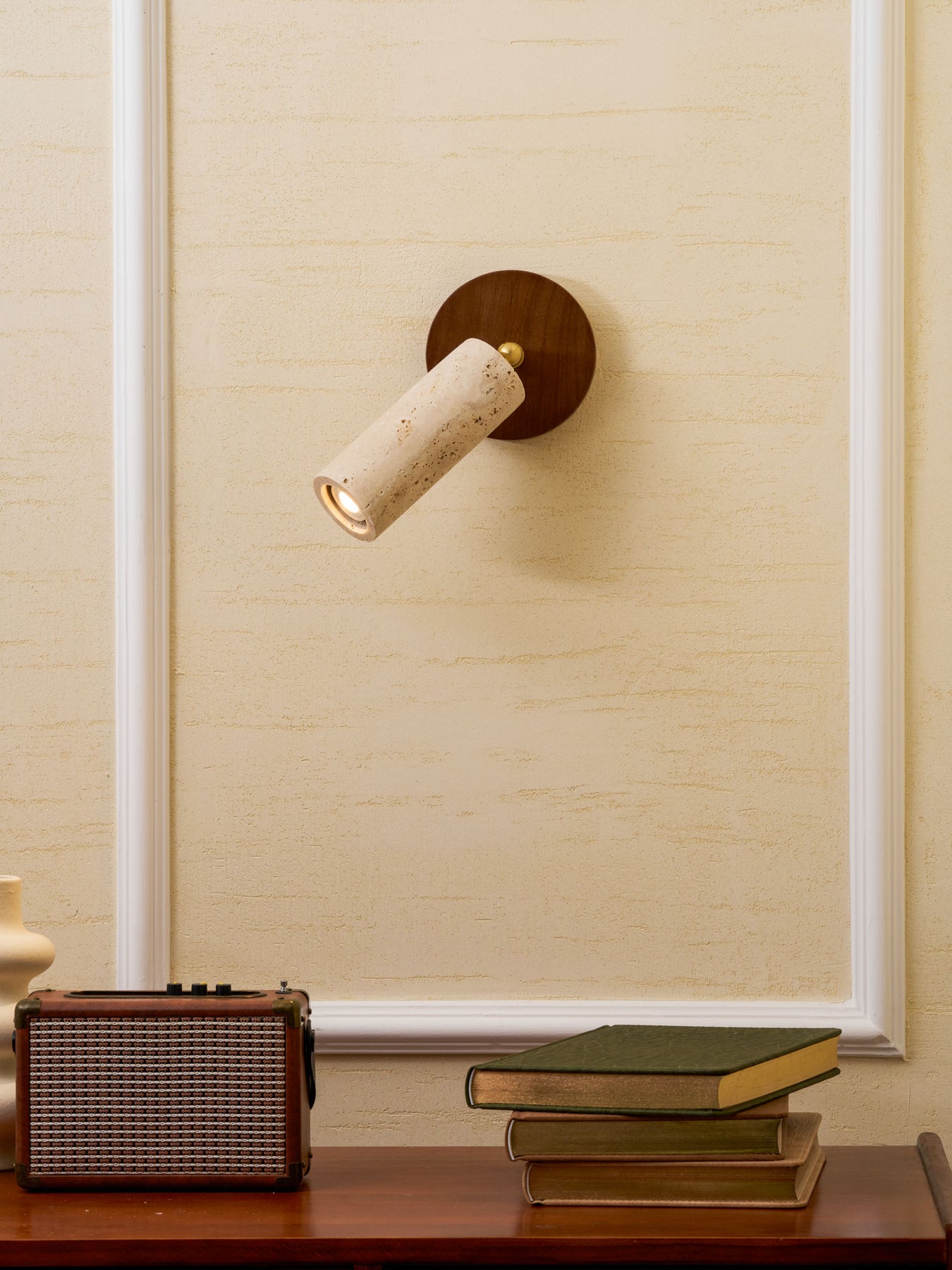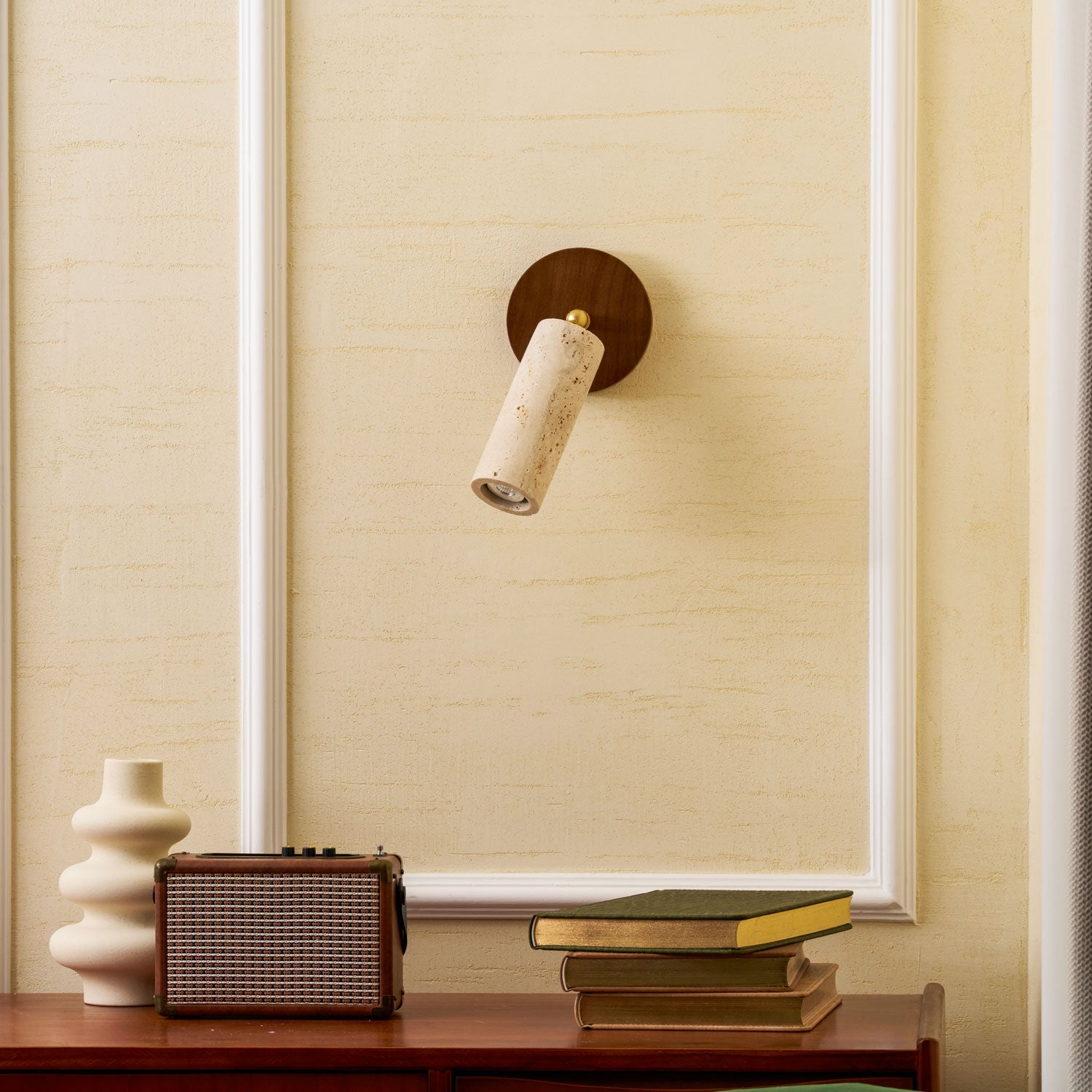The Vakkerlight Solis Stone Spotlight is a fusion of raw nature and refined craftsmanship. Featuring a meticulously sculpted travertine stone cylinder, complemented by a warm walnut wood ceiling mount and brass pivot, this spotlight exudes a timeless elegance. Its adjustable design allows for precise lighting, making it a versatile addition to contemporary interiors—perfect for accentuating artwork, creating ambient mood lighting, or adding a sophisticated touch to hallways and living spaces.