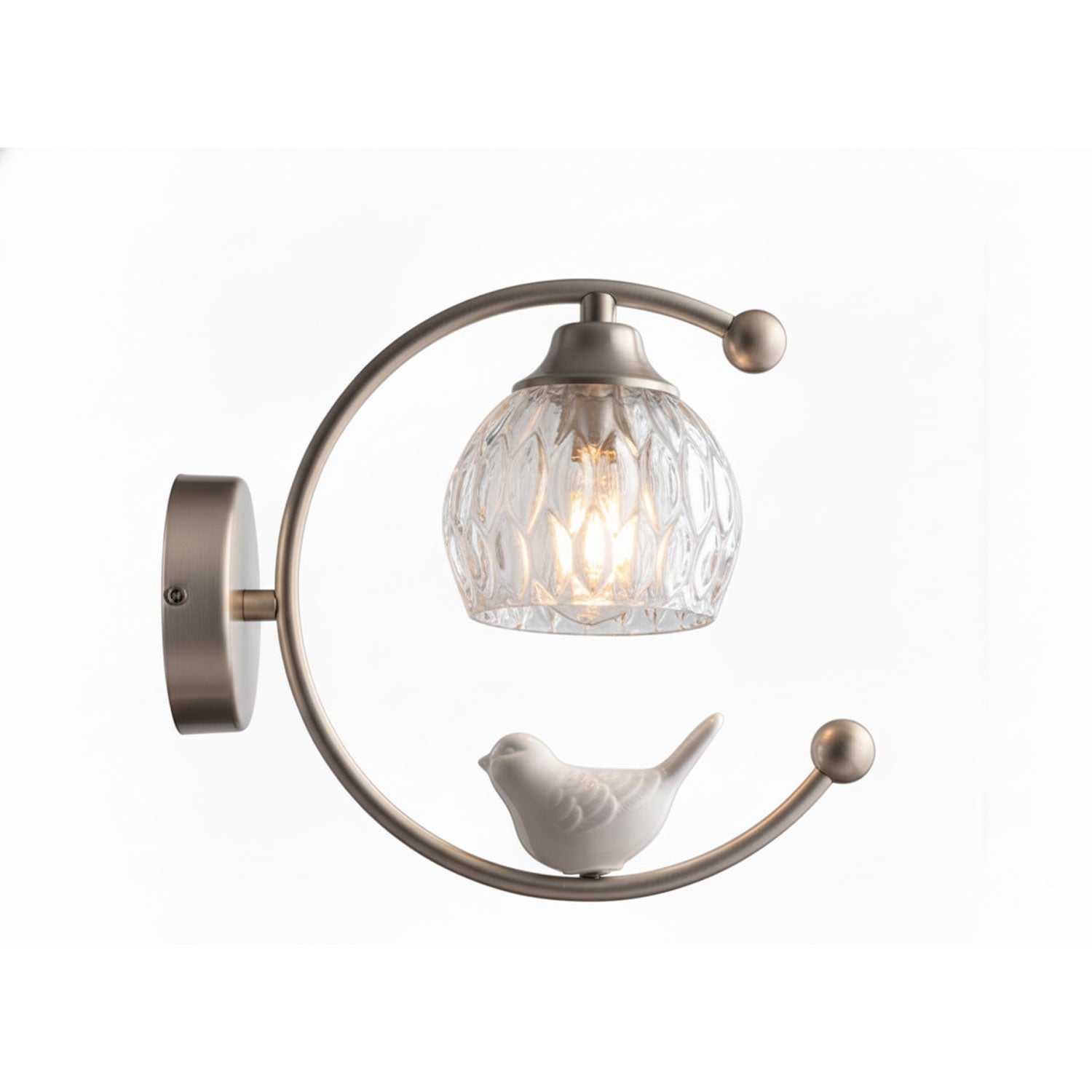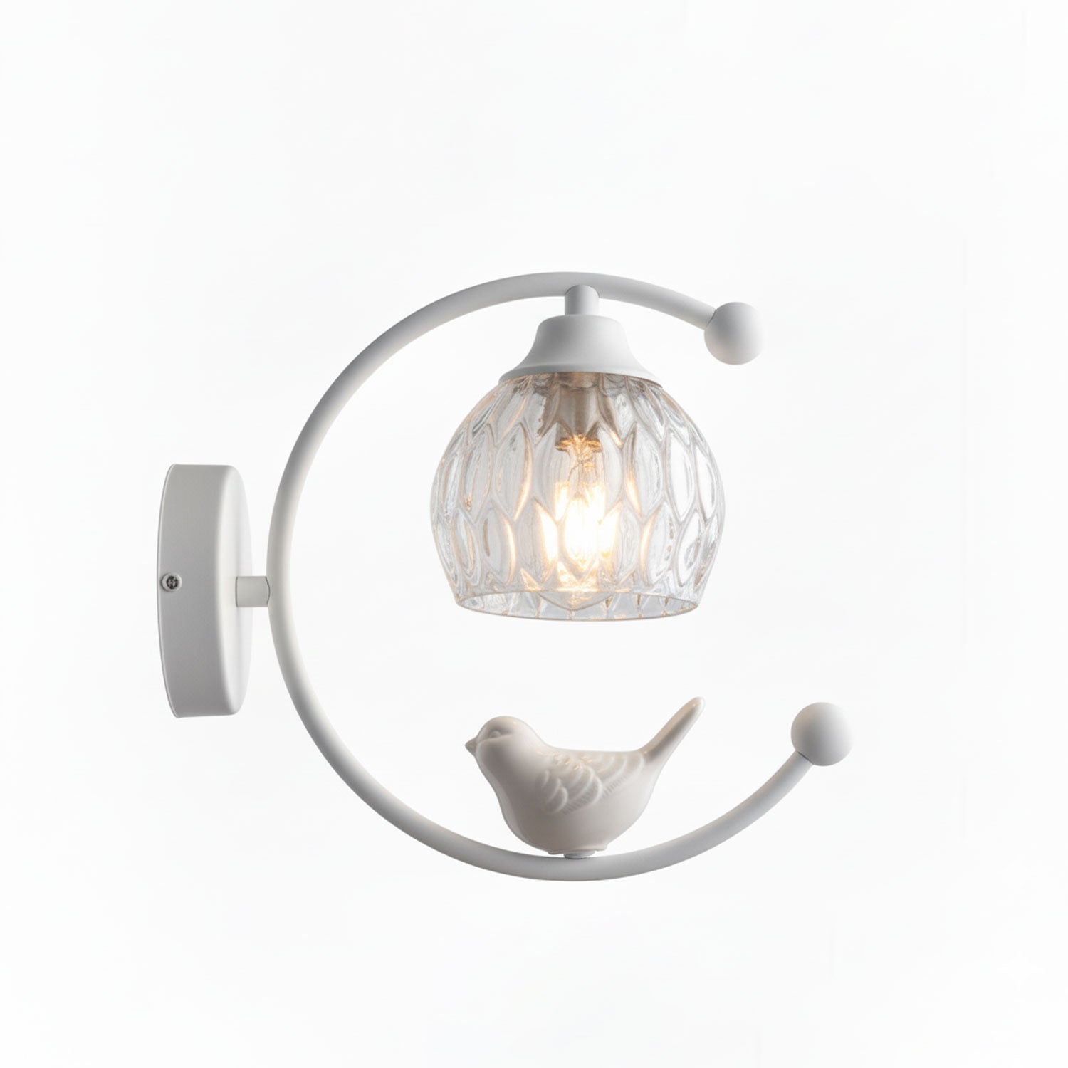 The Nuvia bird-shaped wall lamp captures a moment of tranquility through its design. A delicate ceramic bird perches gracefully on a curved lamp stand, above a textured glass shade through which soft light filters through. The contrast between the crystal-clear glass and the soft white porcelain creates a refined balance between modern elegance and natural charm. This wall lamp is perfect for bedrooms, hallways, or reading nooks, creating a warm and peaceful glow, like the morning sun shining in a serene garden.
