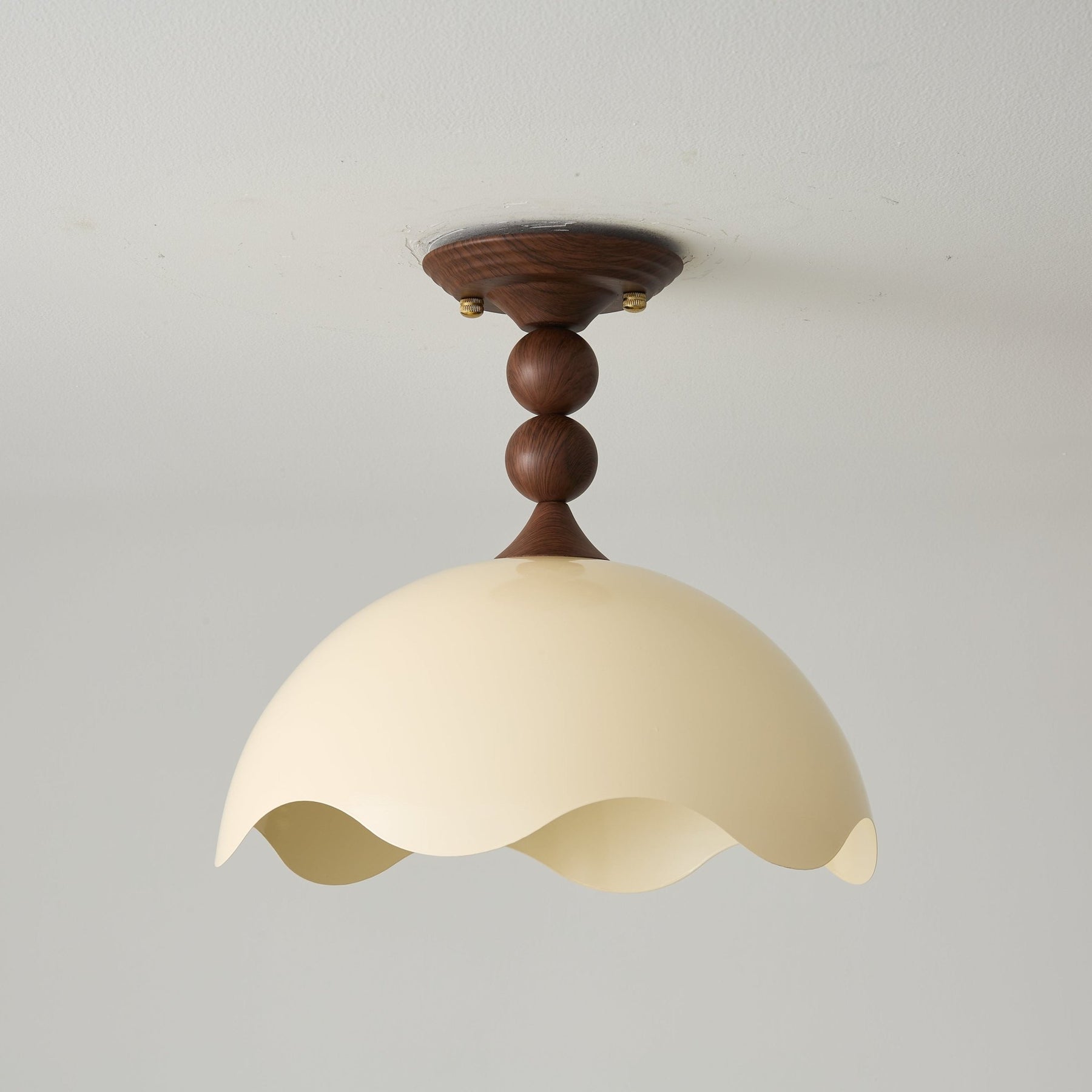 The distinctive scalloped edges of the shade provide soft, diffused light, creating a warm, inviting glow in any room. The combination of the textured wood veneer with the smooth metal body adds an organic yet contemporary charm to the light, making it a perfect focal point in dining rooms, living spaces, or entryways.