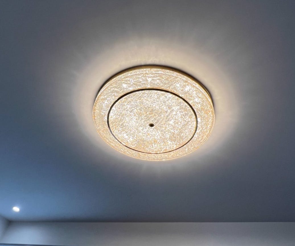 The Vakkerlight Mysterious Circle Ceiling Lamp showcases a unique blend of brass and resin, featuring a cracked glass or crystal-like appearance. Its central ring-shaped light source and surrounding layered rings emit a sophisticated and elegant glow, enhancing the aesthetic appeal of modern interiors.