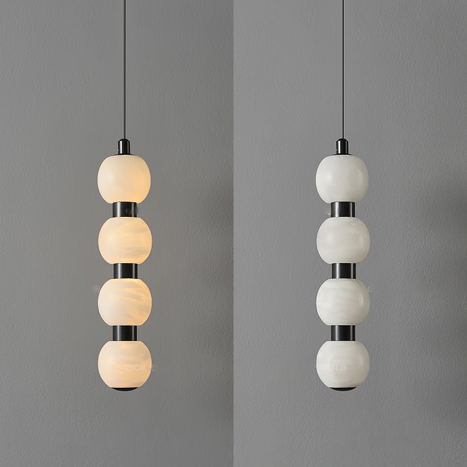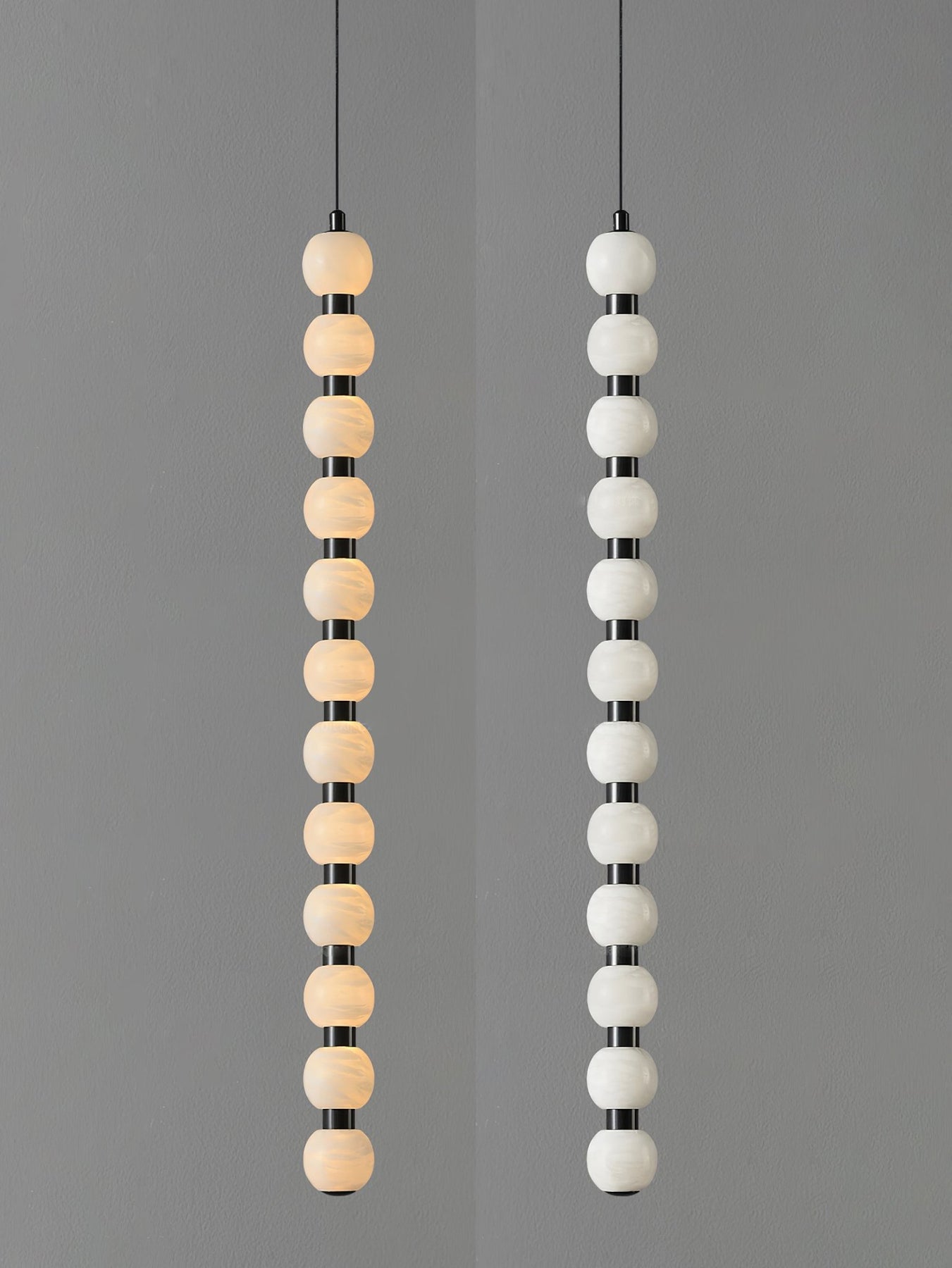 The Orbique Pendant draws inspiration from molecular geometry and minimalist sculpture. Composed of alabaster orbs interspaced with polished metal joints, it forms a vertical rhythm of light and form. Whether clustered or solo, it creates a dynamic focal point in modern interiors—combining precision with poetry.