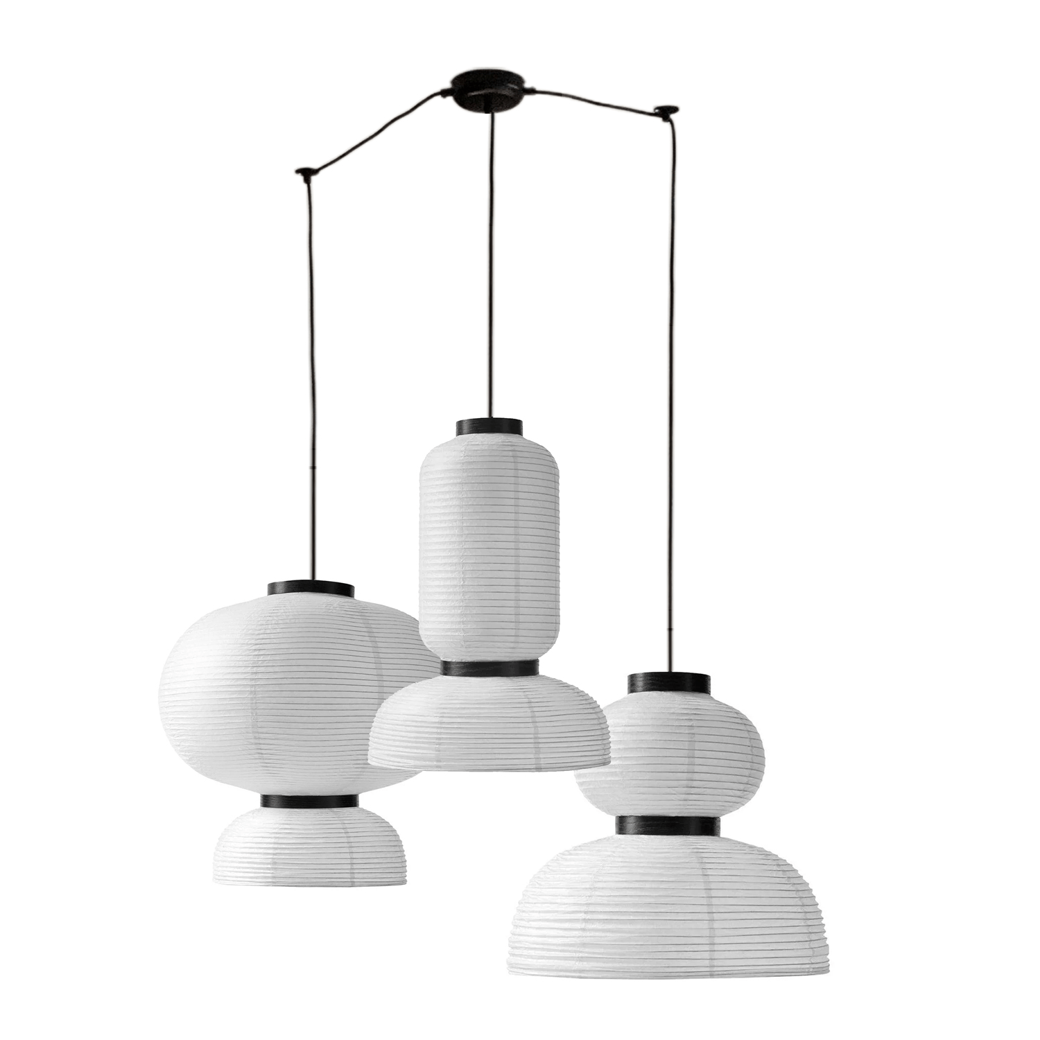 Formakami pendant light is a modern take on classic Asian paper lanterns. Our aim was to create a light pendant that illuminates people's lives both literally and symbolically. The white color of the shade emphasizes the lightness of rice paper and the open bottom maximizes the amount of light. Black stained oak rings give Formakami’s handmade shade a pleasant rhythm. known for his playful designs, has combined round shapes in different sizes, and the end result is a collection of three unique pendant lights.