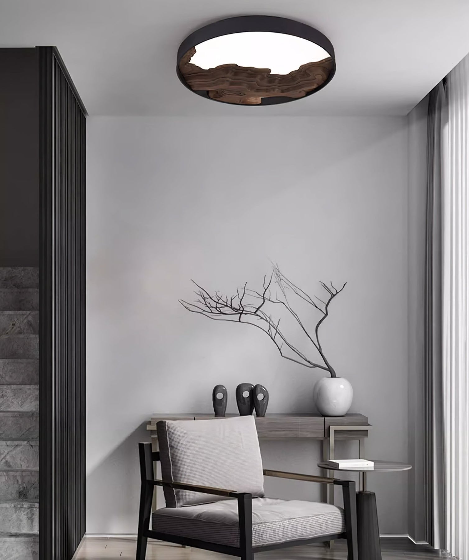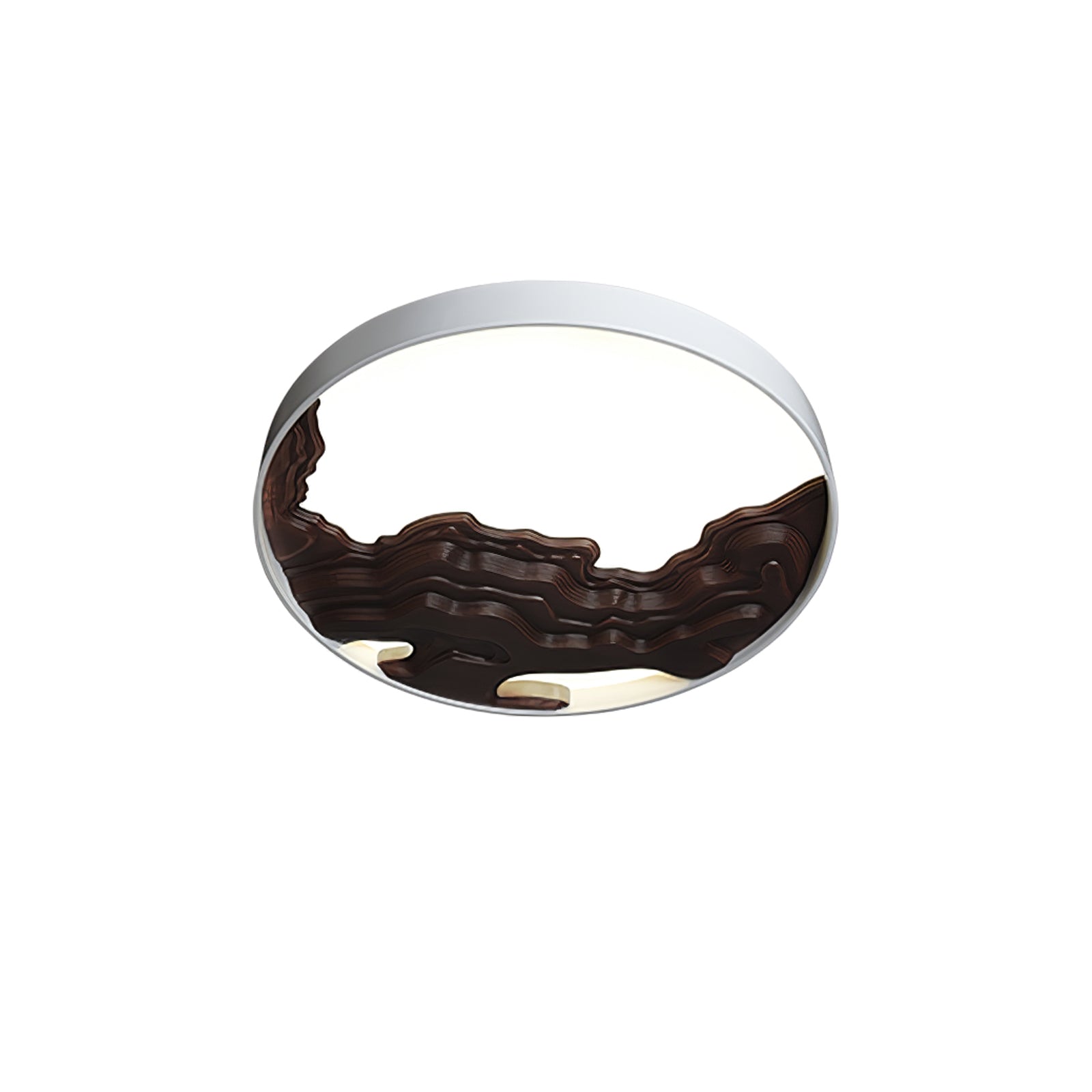 The Strata Ceiling Light brings nature-inspired artistry into contemporary spaces. Featuring a topographic wood veneer design embedded within a sleek, circular black frame, this fixture mimics the layered contours of a natural landscape. A diffused light panel softens the illumination, creating a warm and ambient glow. Ideal for living rooms, hallways, or bedrooms, the Strata Ceiling Light is both a functional luminaire and a sculptural ceiling feature.