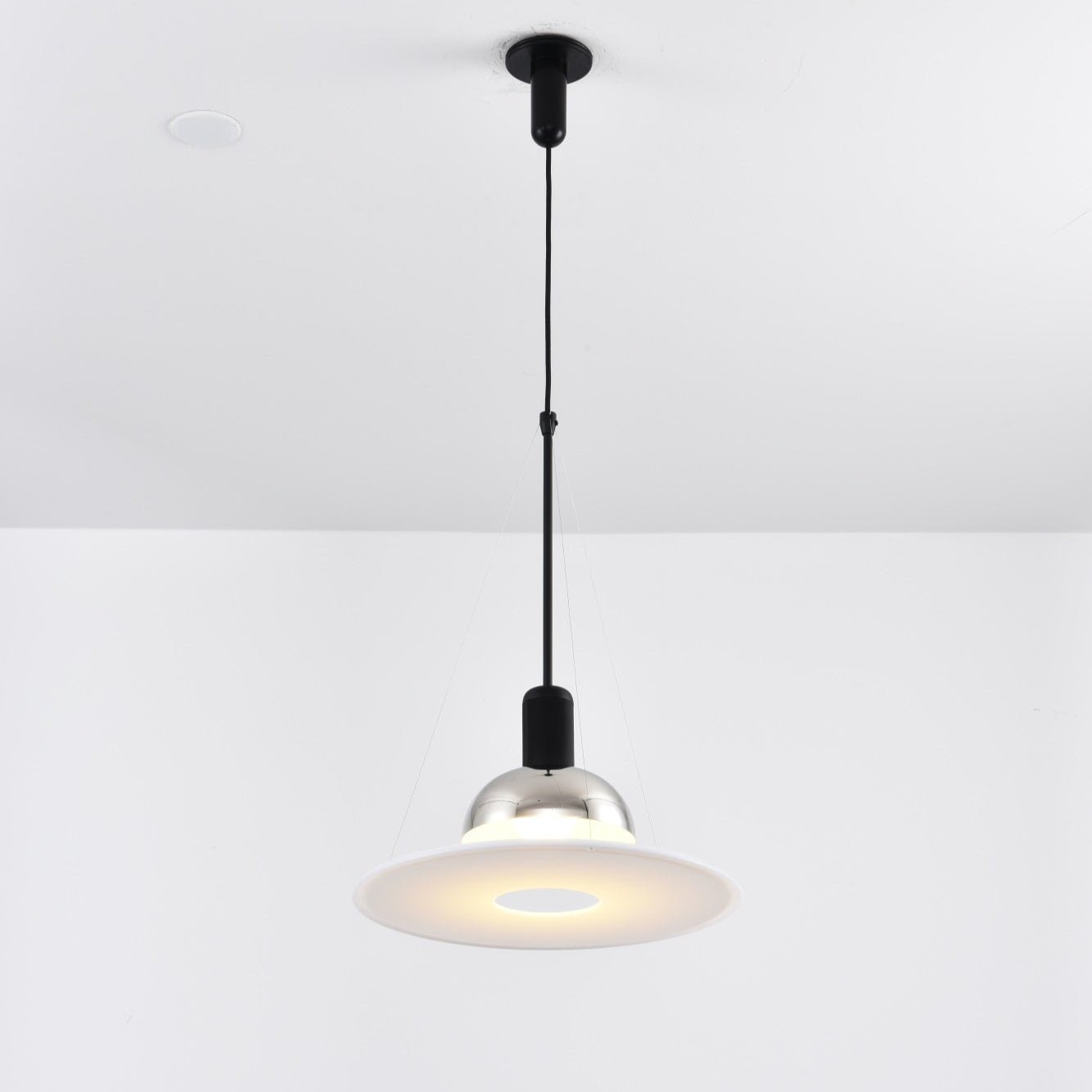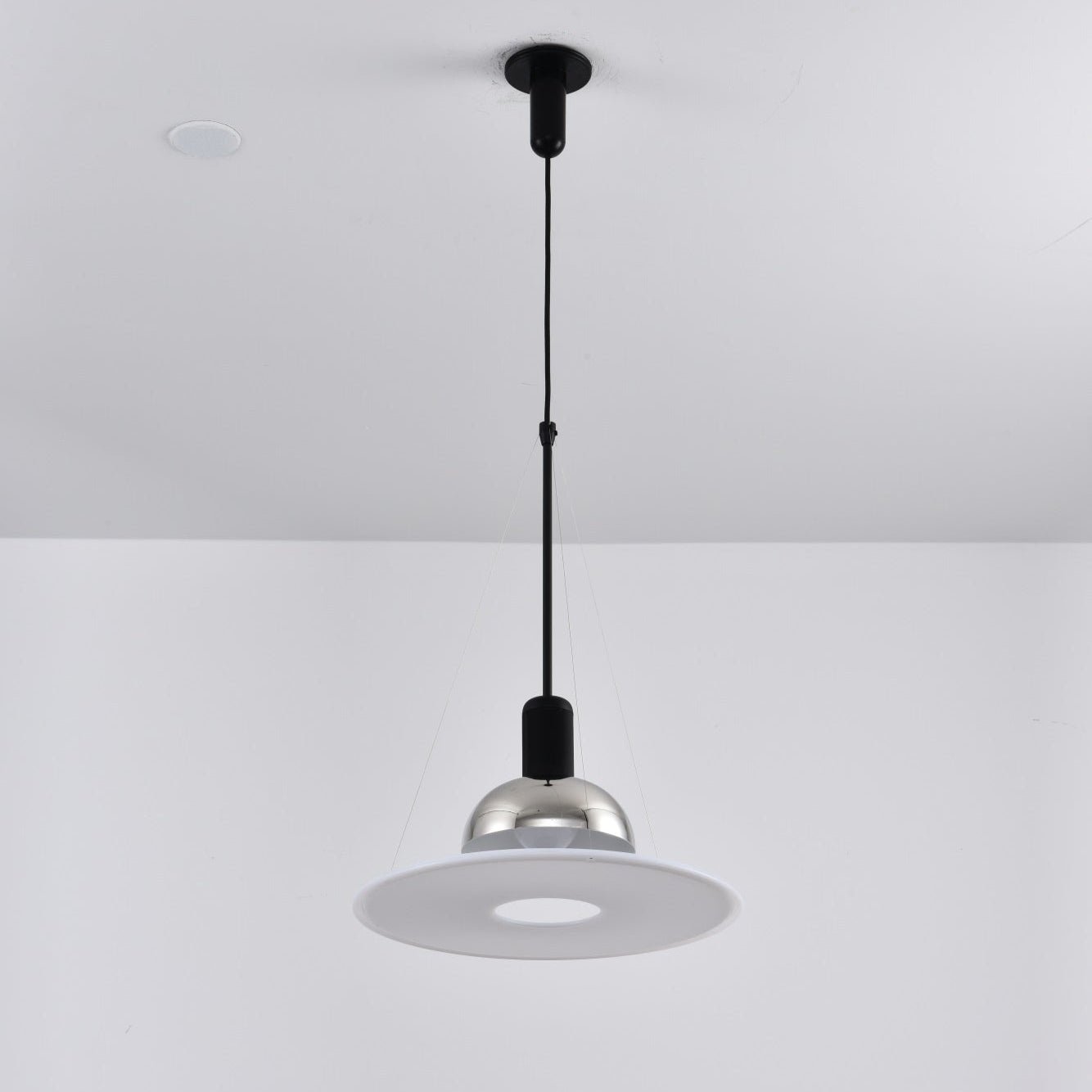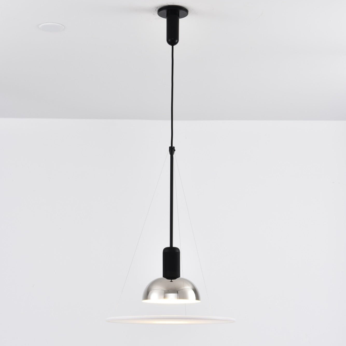 Flying Saucer Pendant Light offers a blend of direct, diffused, and reflected illumination. The light features an opaline polymethylmethacrylate (PMMA) diffuser plate, crafted through injection molding and elegantly suspended by three slender steel cables. Its polished, nickel-plated reflector, made from zapon-varnished stamped sheet metal, boasts a sleek gloss-white interior. Completing the design is a black-painted, injection-molded ABS ceiling fitting and rose.