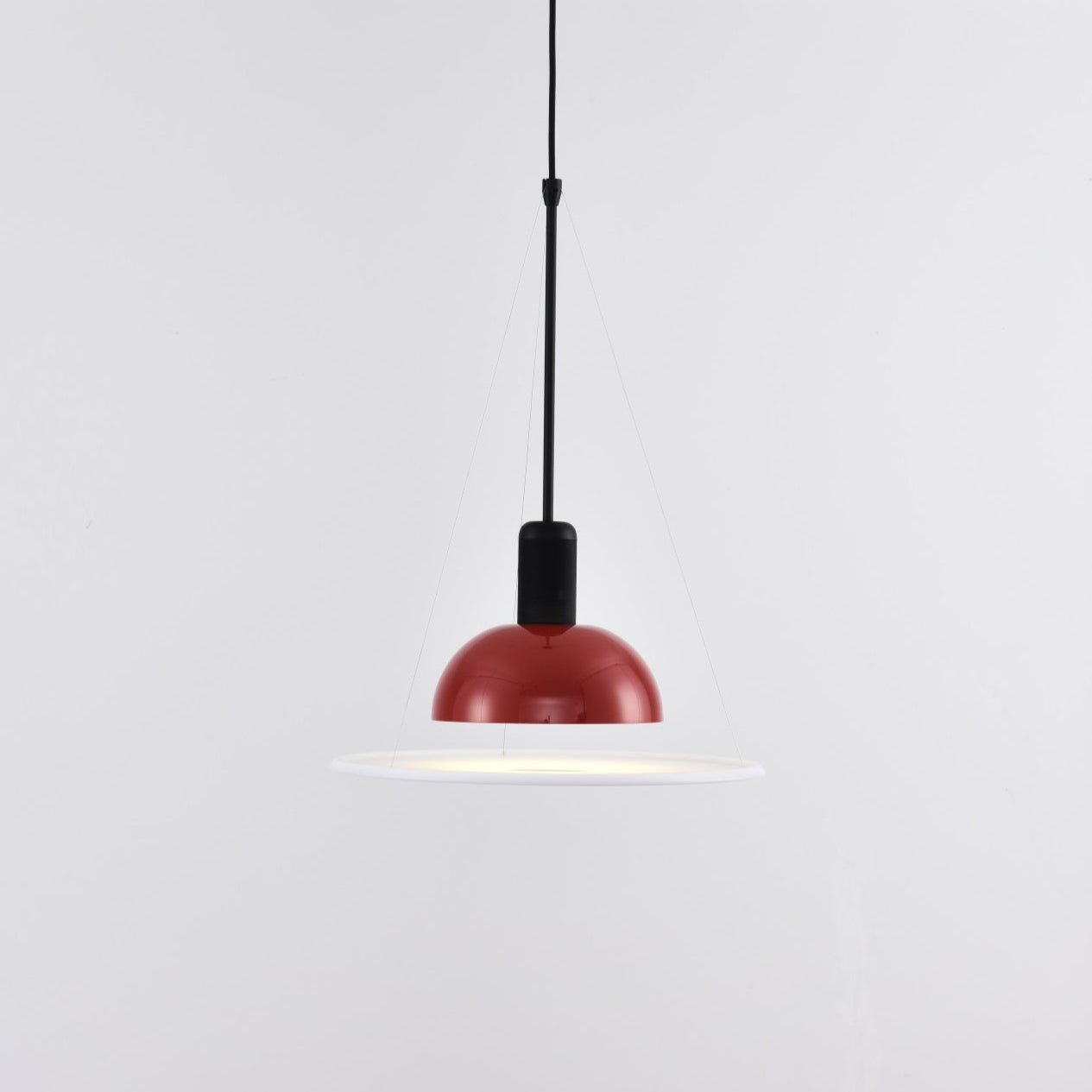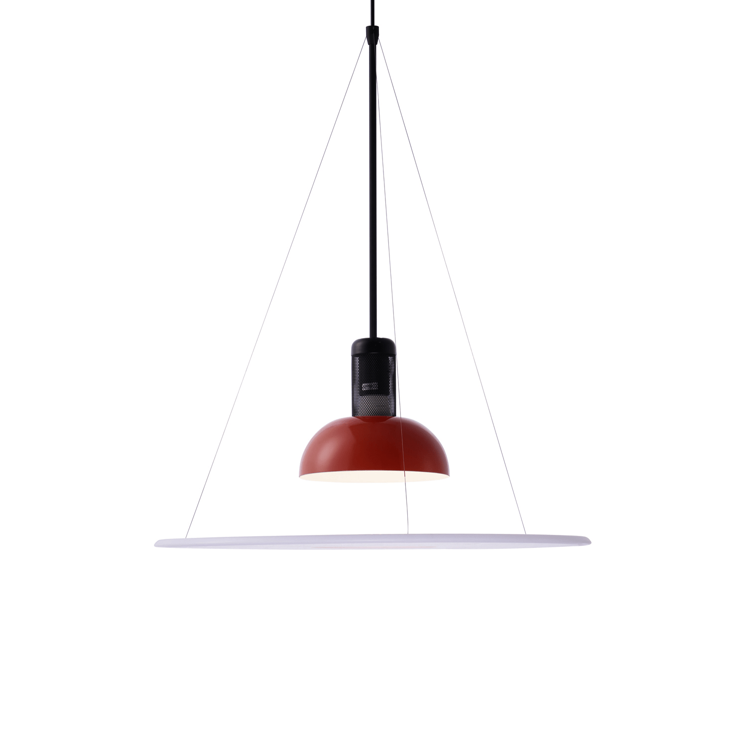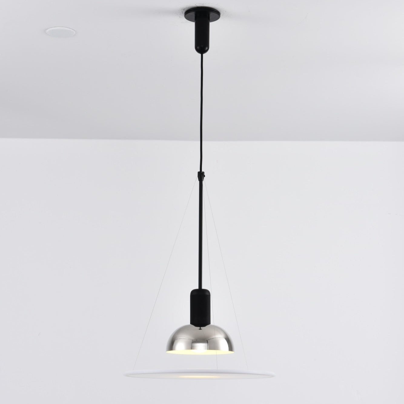 Flying Saucer Pendant Light offers a blend of direct, diffused, and reflected illumination. The light features an opaline polymethylmethacrylate (PMMA) diffuser plate, crafted through injection molding and elegantly suspended by three slender steel cables. Its polished, nickel-plated reflector, made from zapon-varnished stamped sheet metal, boasts a sleek gloss-white interior. Completing the design is a black-painted, injection-molded ABS ceiling fitting and rose.