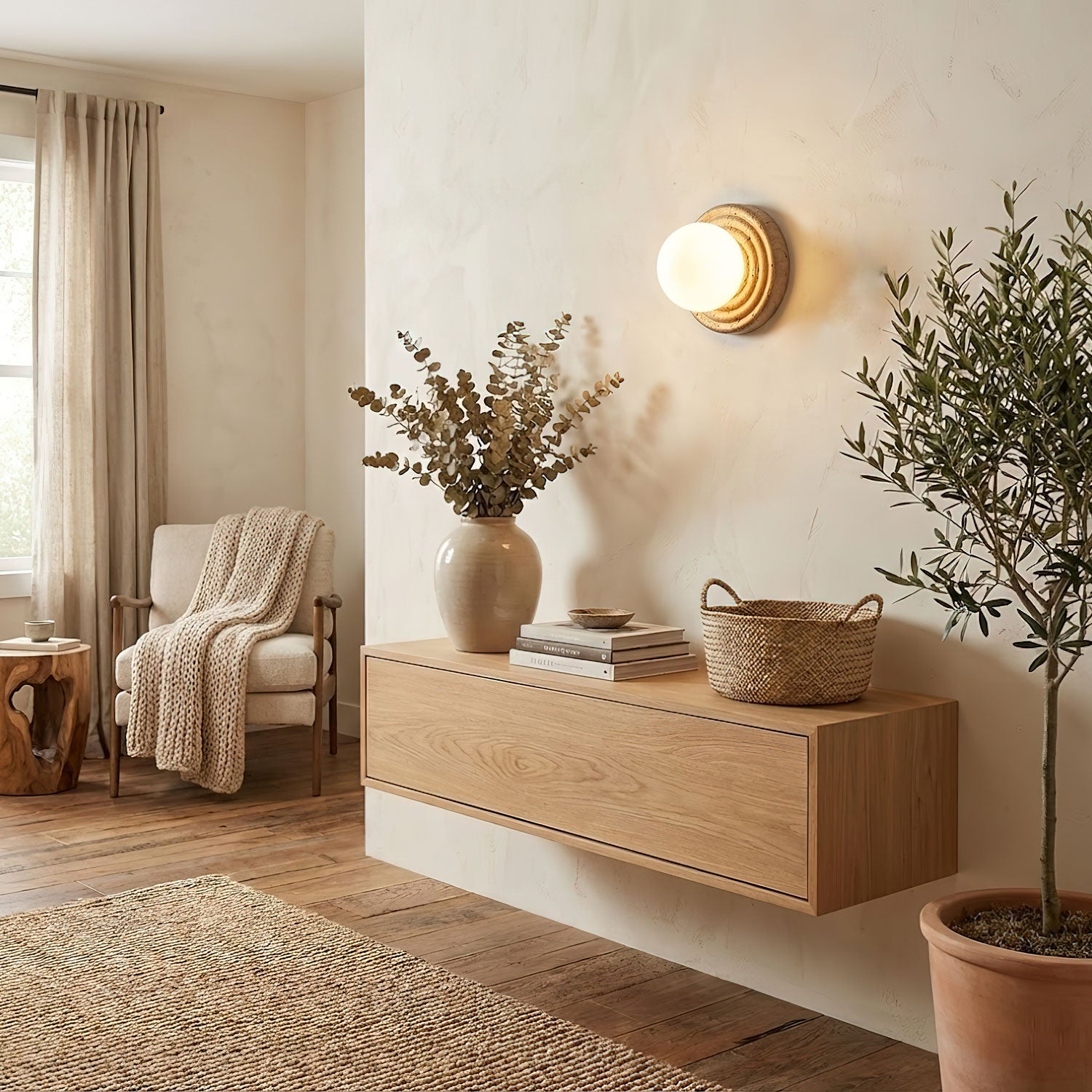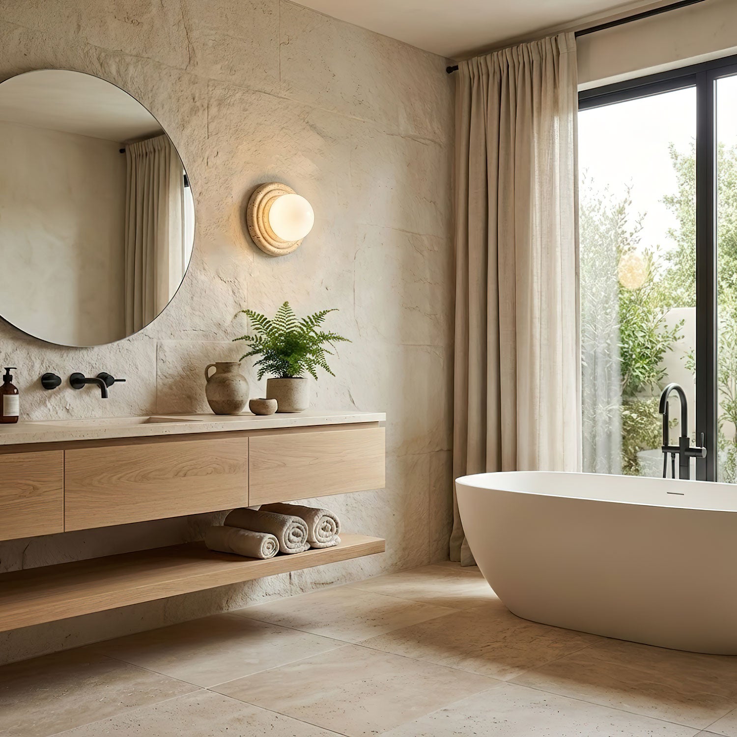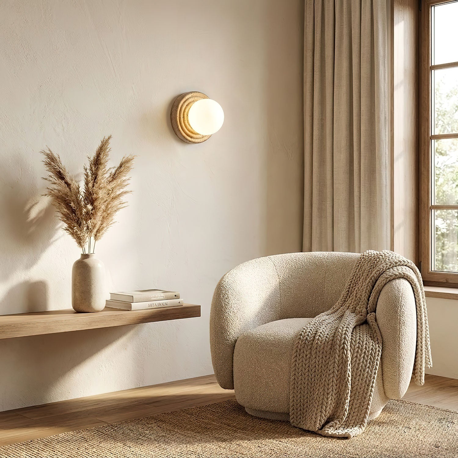 The Elira Wall Sconce by Vakkerlight is a poetic fusion of nature and modern artistry. Featuring a soft, glowing opal glass orb cradled by a carved travertine base, the design evokes a sense of calm and quiet luxury. The concentric ridges in the stone add depth and texture, creating a sculptural statement piece even when unlit. Elira is perfect for adding warmth and architectural elegance to living rooms, bedrooms, or curated spaces that value timeless design and natural materials.
