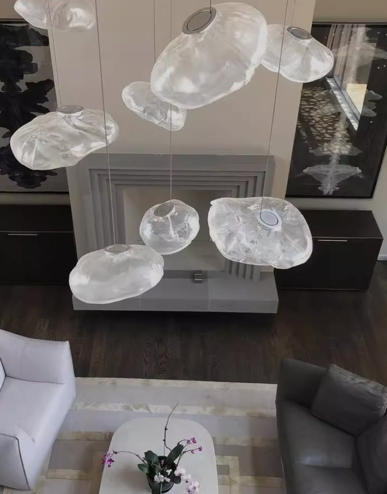 Chandeliers and Pendants: These are the focal points of the living room, especially in rooms with higher ceilings. To size appropriately, use the room dimension formula and ensure the fixture is in scale with the room’s layout. A general rule is to ensure there is at least 7 feet of clearance between the fixture and the floor.