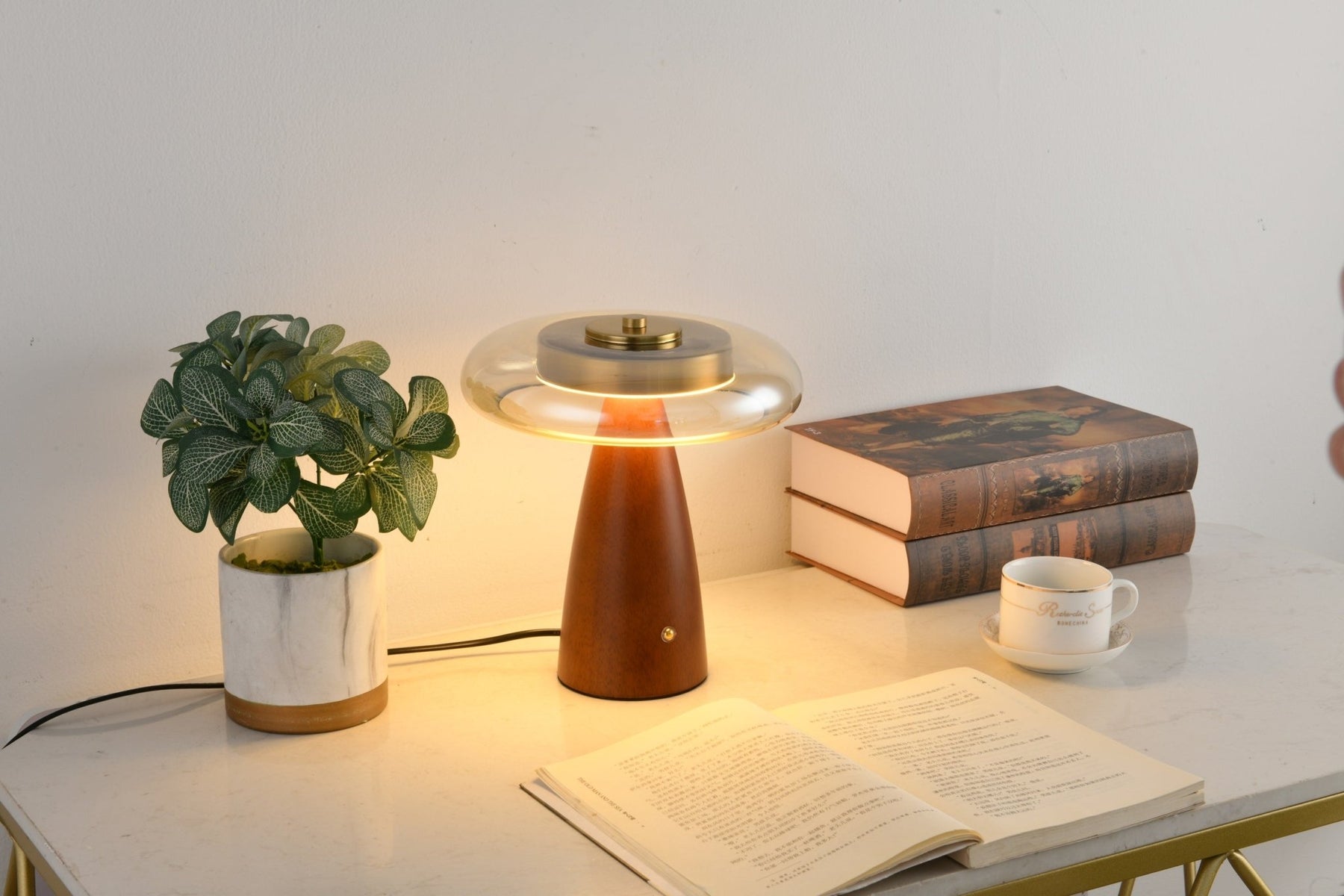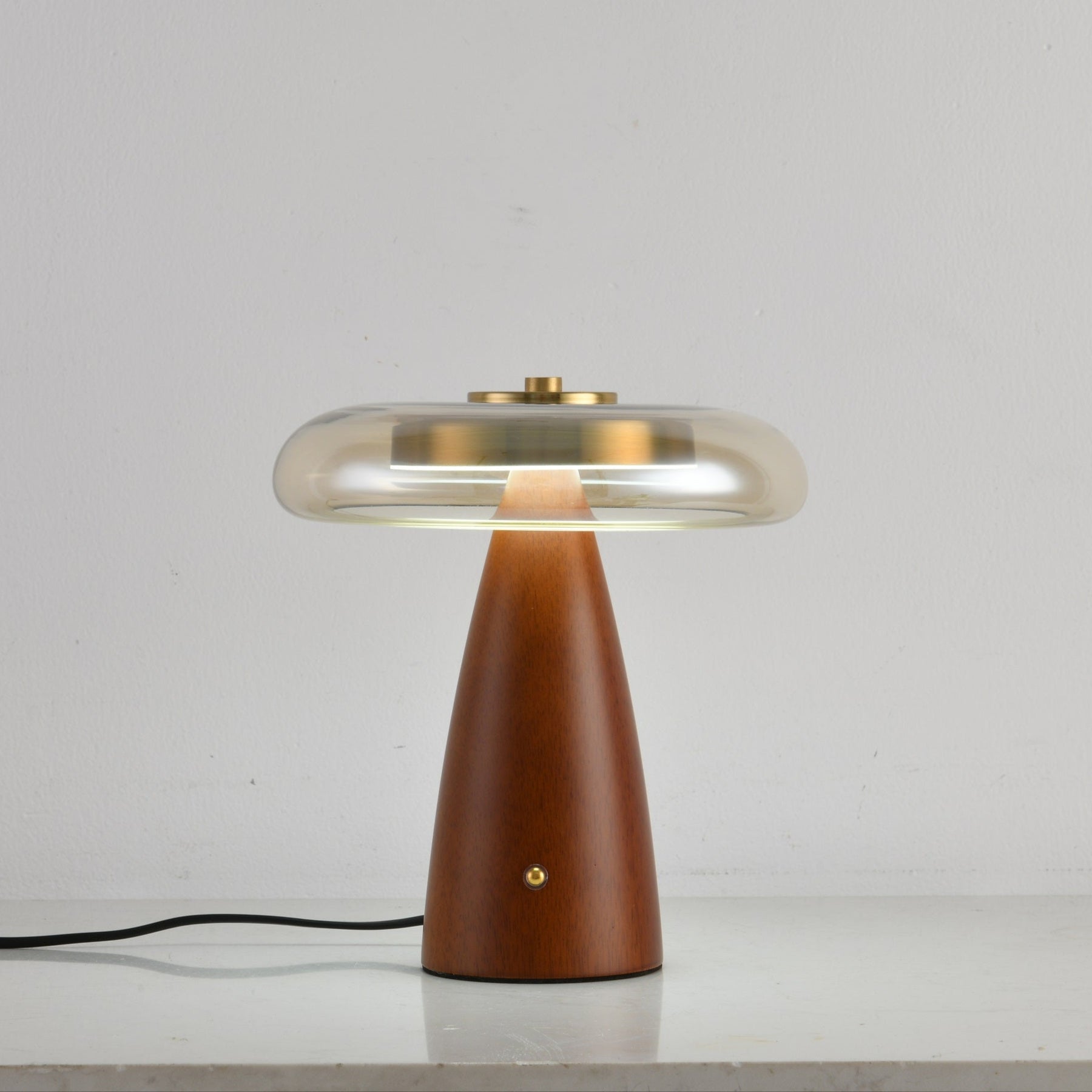 The Belluno Table Lamp by Vakkerlight is a modern reinterpretation of classic elegance. Featuring a sculpted wooden base and a softly curved glass shade with golden accents, this lamp brings a warm, inviting glow to any interior. Its sophisticated silhouette and refined materials create a timeless piece that enhances both contemporary and vintage-inspired spaces with effortless charm.