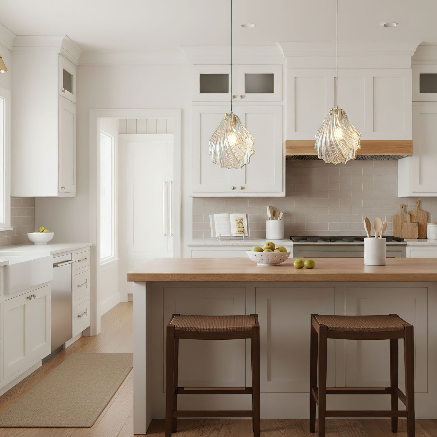 Pendants Over Island: These provide crucial task lighting for food prep and should hang 32-36 inches above the surface. Make sure that each pendant is about 1/4 the length of the island to provide sufficient coverage without overwhelming the space.