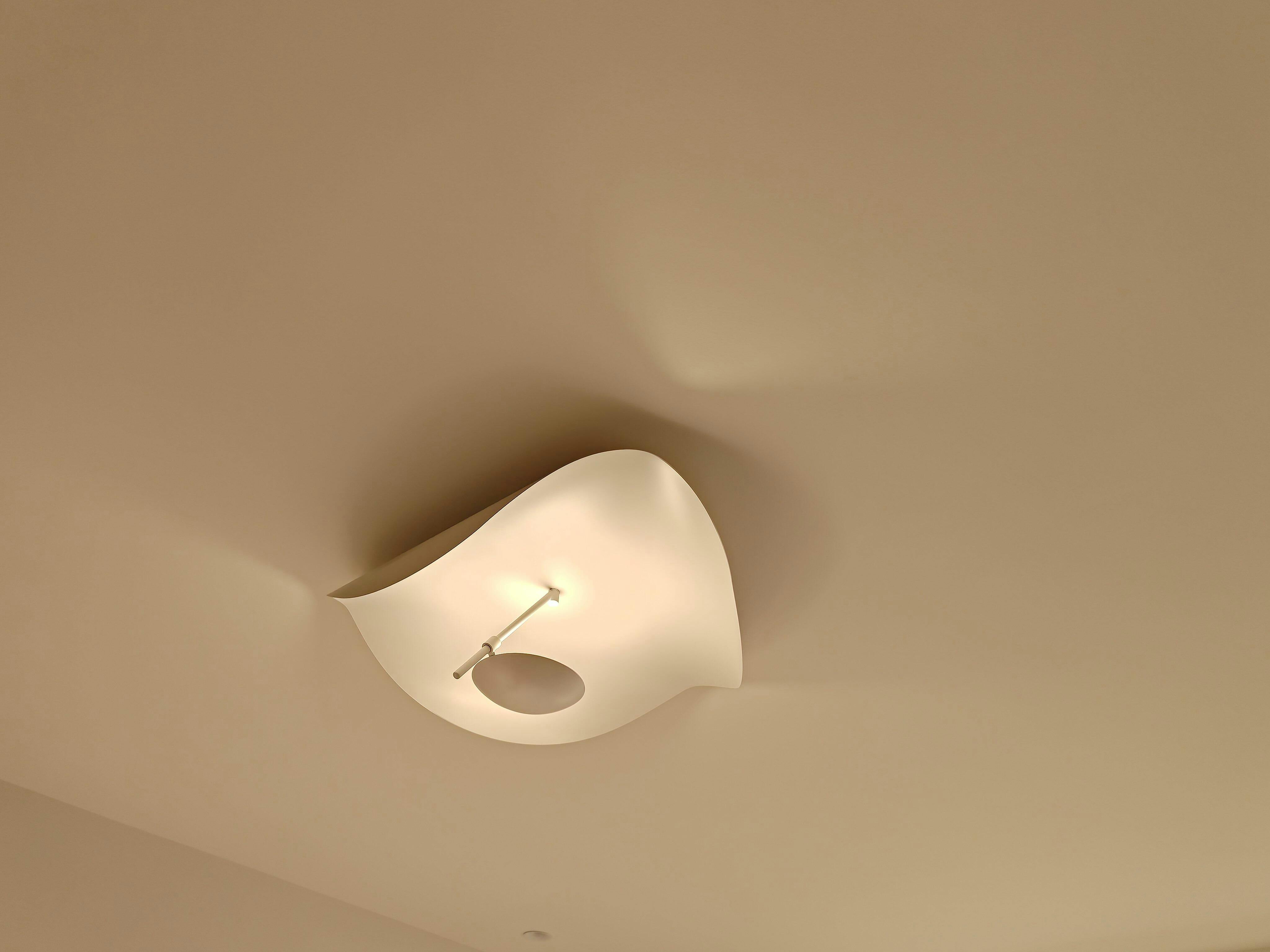 The Giorgio Ceiling Light features a gracefully curving shade that embodies fluidity and the accuracy of the motion required to draw a line, with a disc shade extending out with a metal rod. Finished in White with the option of a White, Satin, or Gold rod. May be ceiling or wall-mounted.