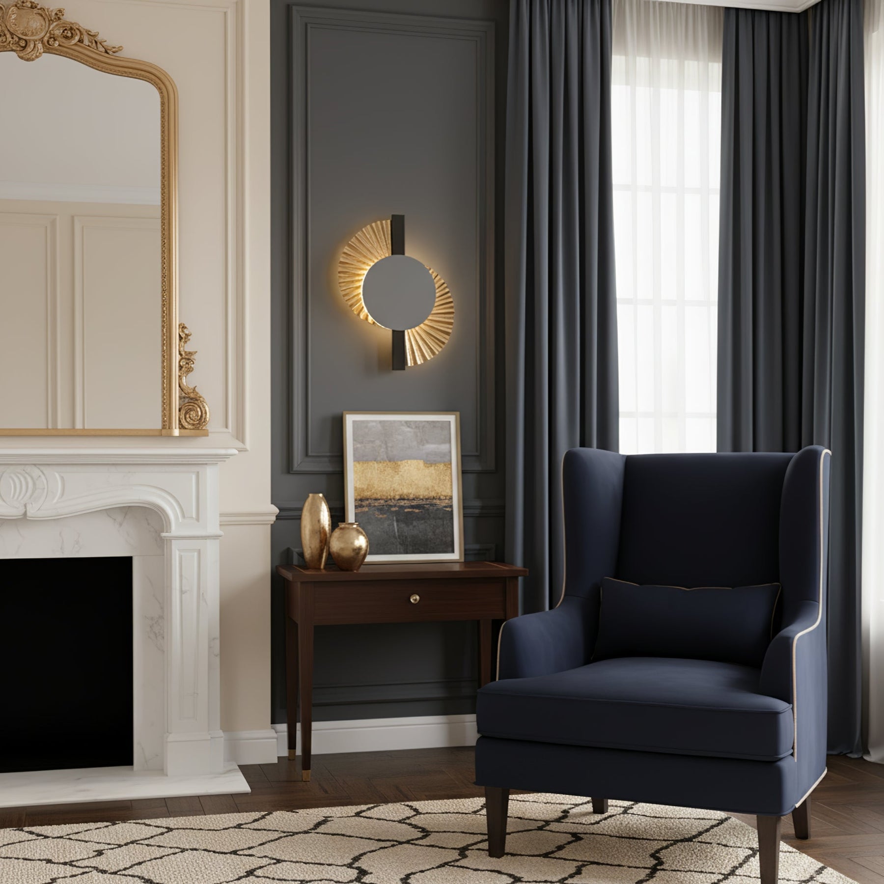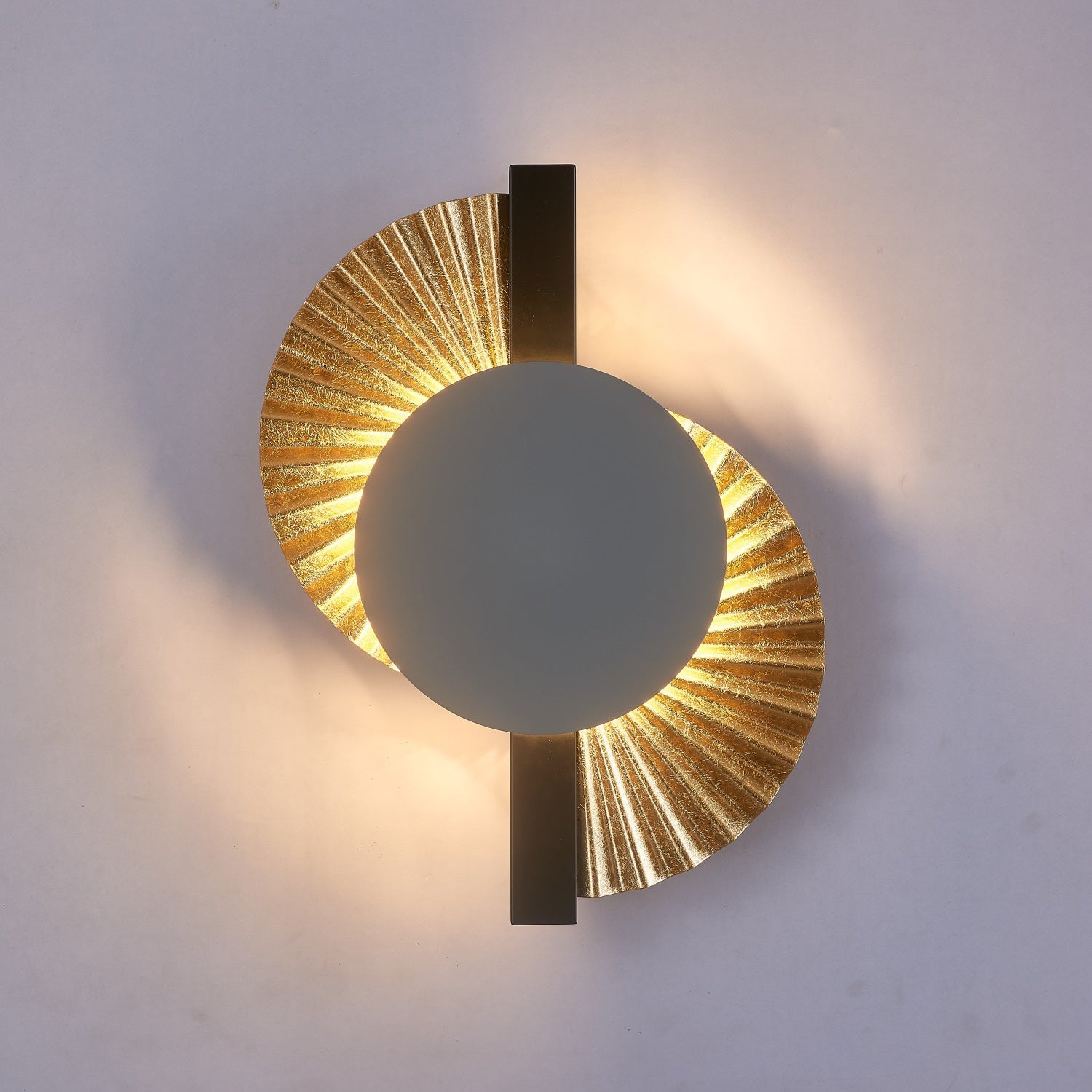 This wall sconce showcases a striking design with golden, fan - like elements radiating from a central circular panel. Paired with a sleek black vertical strip, it emits a warm, ambient glow. Blending opulent charm with modern artistry, it’s perfect for adding a touch of luxury and unique style to interior walls, serving as both a functional lighting fixture and a captivating decor piece.
