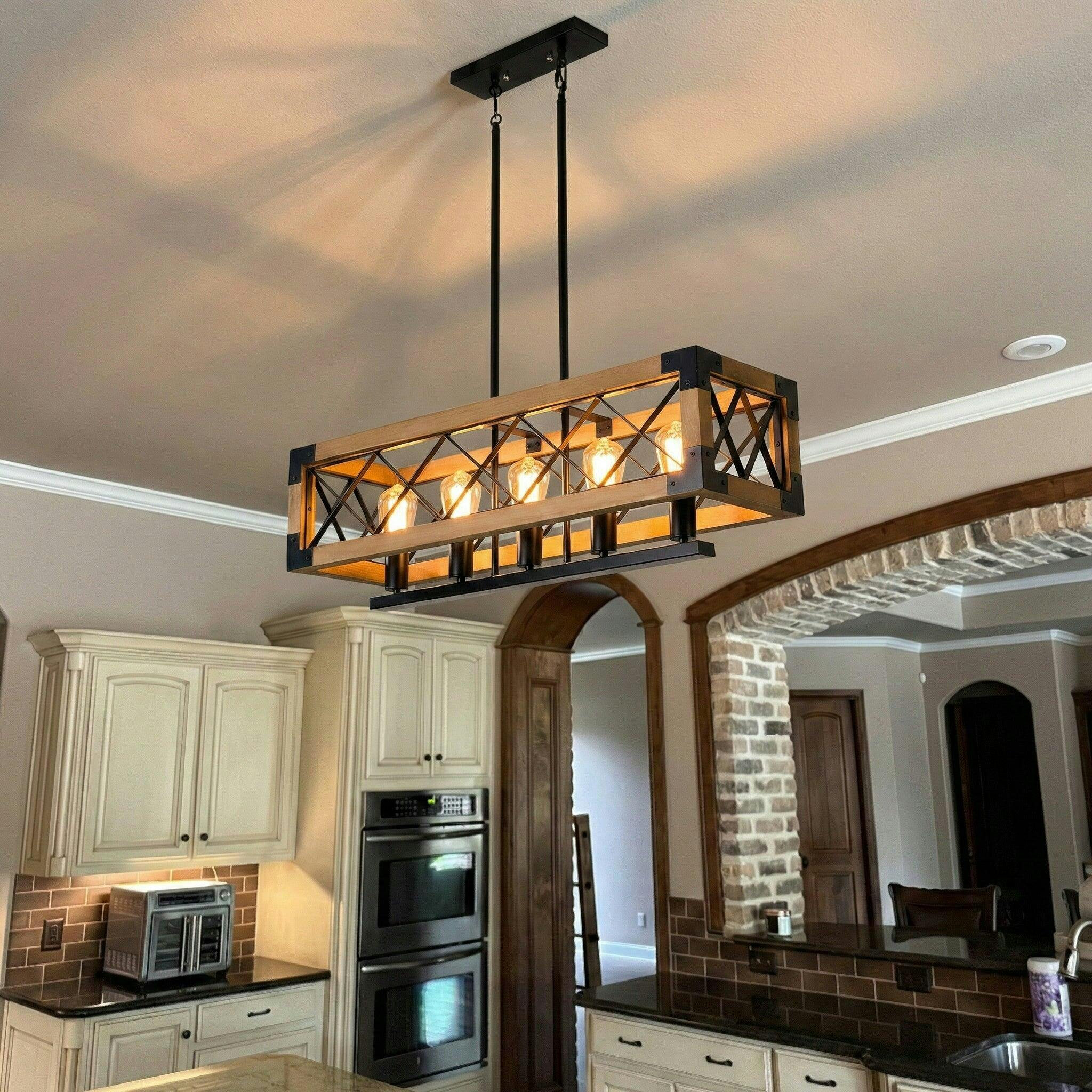 The perfect combination of wood and metal to create a unique modern farmhouse style, Hanging directly this charming 5-light island light fixture over your dining table or kitchen island , bright lighting. With Oak wood, The kitchen island chandelier light is durable and beautiful. With 5 bulbs (not included ), this pendant light can illuminate your space with it's bright but warm light. Made with a rectangular wooden cage shape shade, it is not only your industrial kitchen island pendant lighting, but also an ornament for your home table.