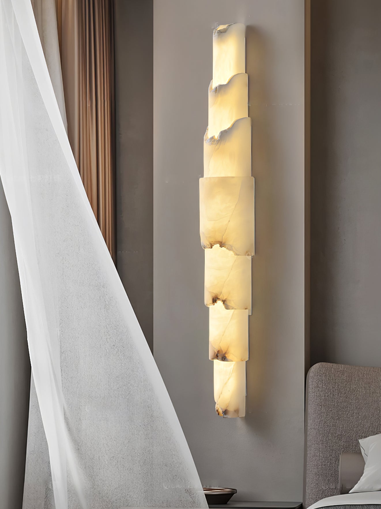 The Cascading Alabaster Wall Sconce by Vakkerlight is a dramatic statement piece inspired by the natural beauty of sculpted stone. Featuring a vertical arrangement of tiered alabaster segments, each with organically fractured edges, this sconce creates a cascading visual effect reminiscent of a natural cliffside. The warm, diffused glow highlights the unique veining and texture of each alabaster piece, adding depth and ambiance to any space. Handcrafted with artistic precision, this wall sconce reflects Vakkerlight's commitment to merging raw natural materials with elegant, architectural form. Ideal for luxury interiors, grand entryways, or feature walls.