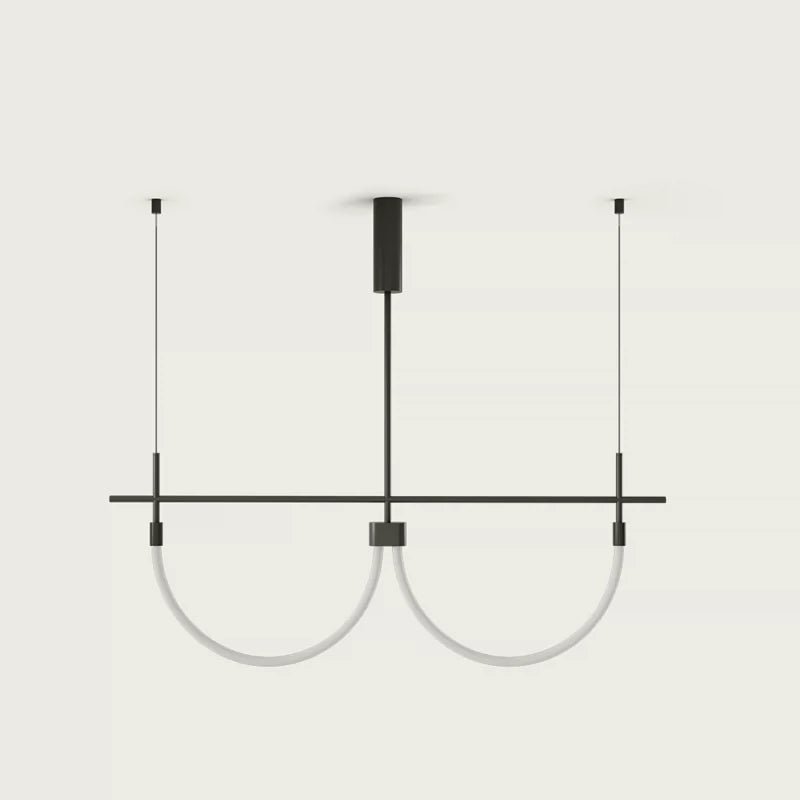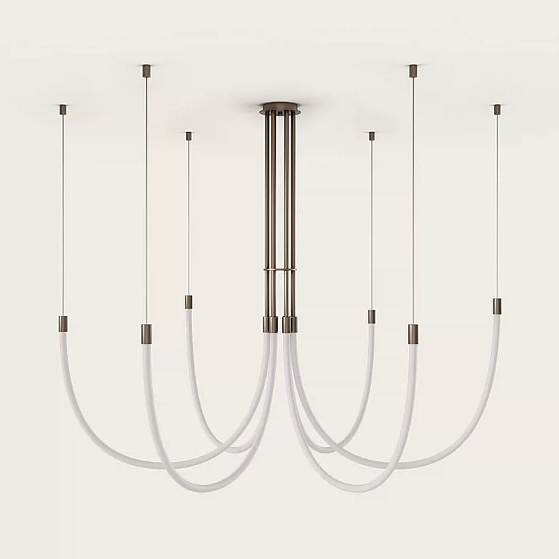 The Serpentine Chandelier features a sculptural composition of flowing silicone tubes suspended from a refined steel frame. Graceful looping lines create a soft, dynamic silhouette, while the clean metallic structure adds a modern architectural edge.