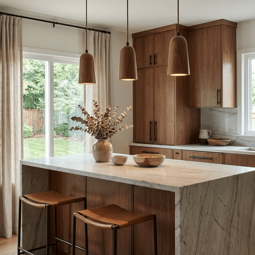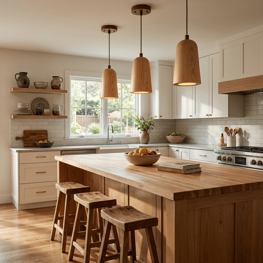 Pendants Over Island: These provide crucial task lighting for food prep and should hang 32-36 inches above the surface. Make sure that each pendant is about 1/4 the length of the island to provide sufficient coverage without overwhelming the space.