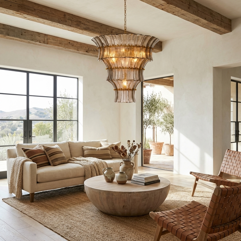 Chandeliers and Pendants: These are the focal points of the living room, especially in rooms with higher ceilings. To size appropriately, use the room dimension formula and ensure the fixture is in scale with the room’s layout. A general rule is to ensure there is at least 7 feet of clearance between the fixture and the floor.