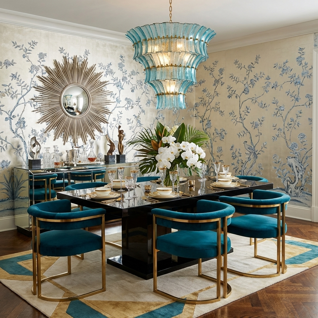 - Chandeliers: As the centerpiece of the dining room, the chandelier should be wide enough to complement the size of the dining table but not so wide that it overwhelms the space. A diameter of 1/2 to 2/3 the table width is a good guide.