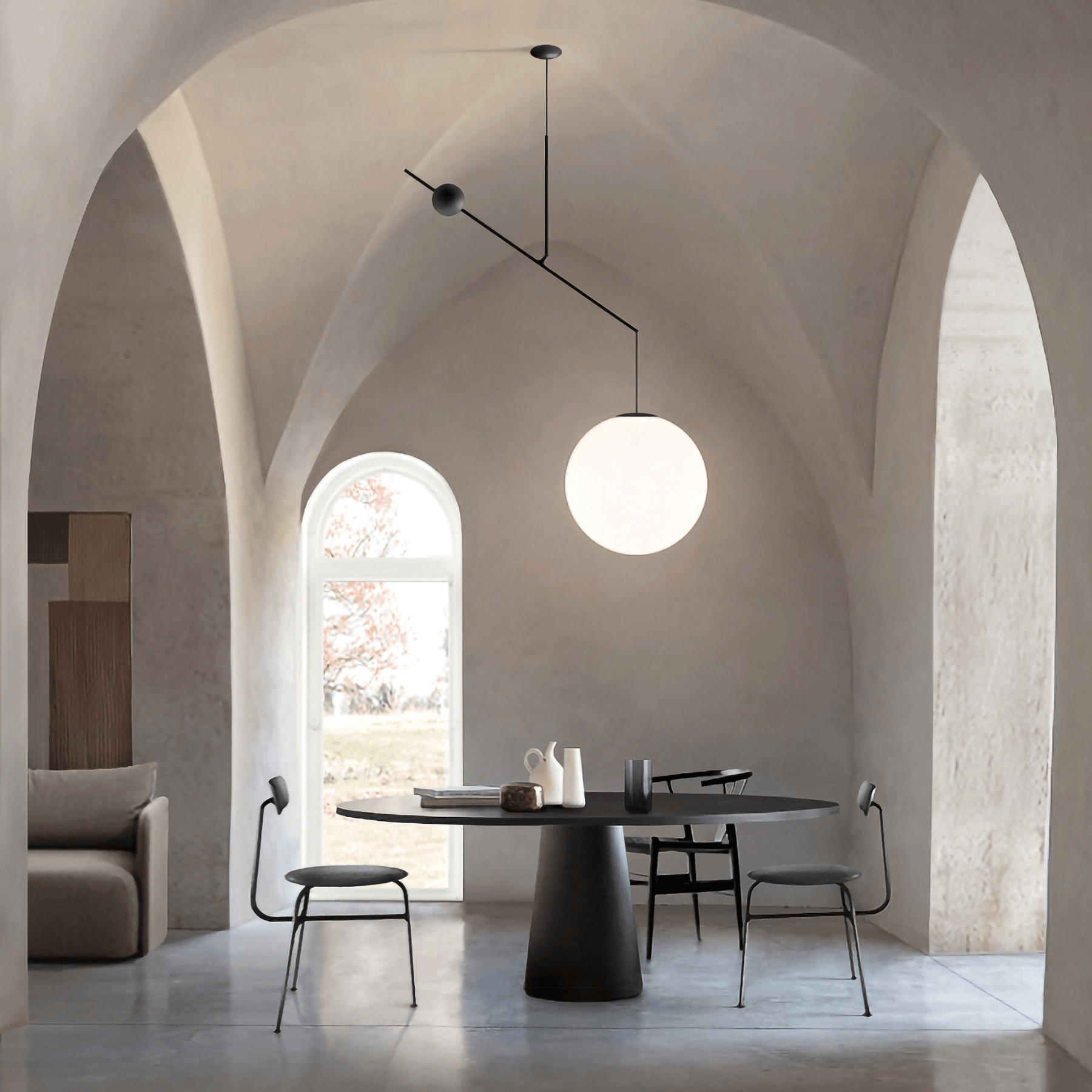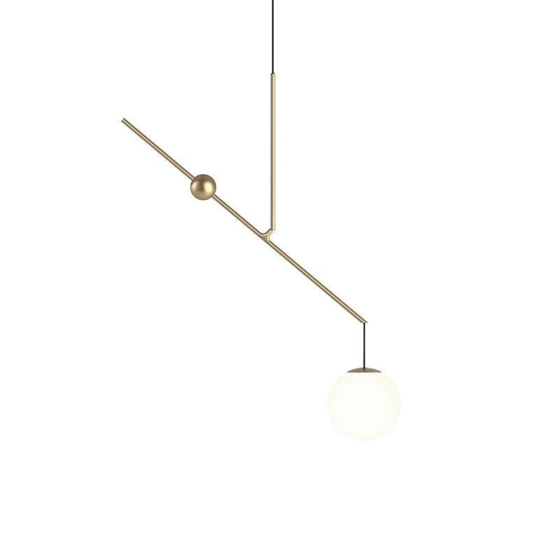 The Equinox Balance Pendant is a refined expression of modern minimalism, inspired by the concept of balance and clean geometric lines. A slender black steel frame extends horizontally from a central suspension point, creating a striking asymmetrical composition. On one end, a small spherical counterweight adds visual equilibrium, while the opposite end supports a softly glowing opal glass globe.